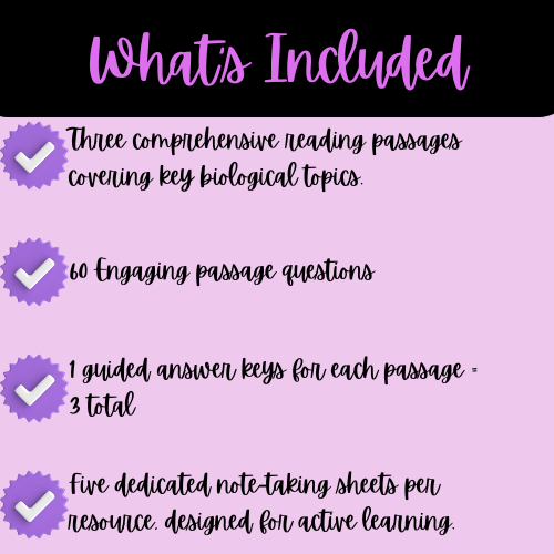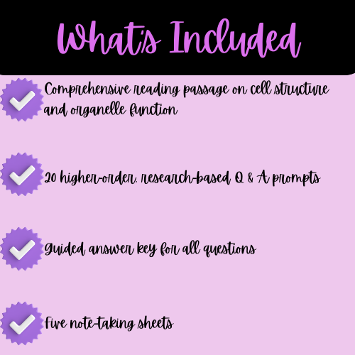 High School Cell Structure & Organelles Functions Reading Passage, Q & A, & Note-Taking Sheets