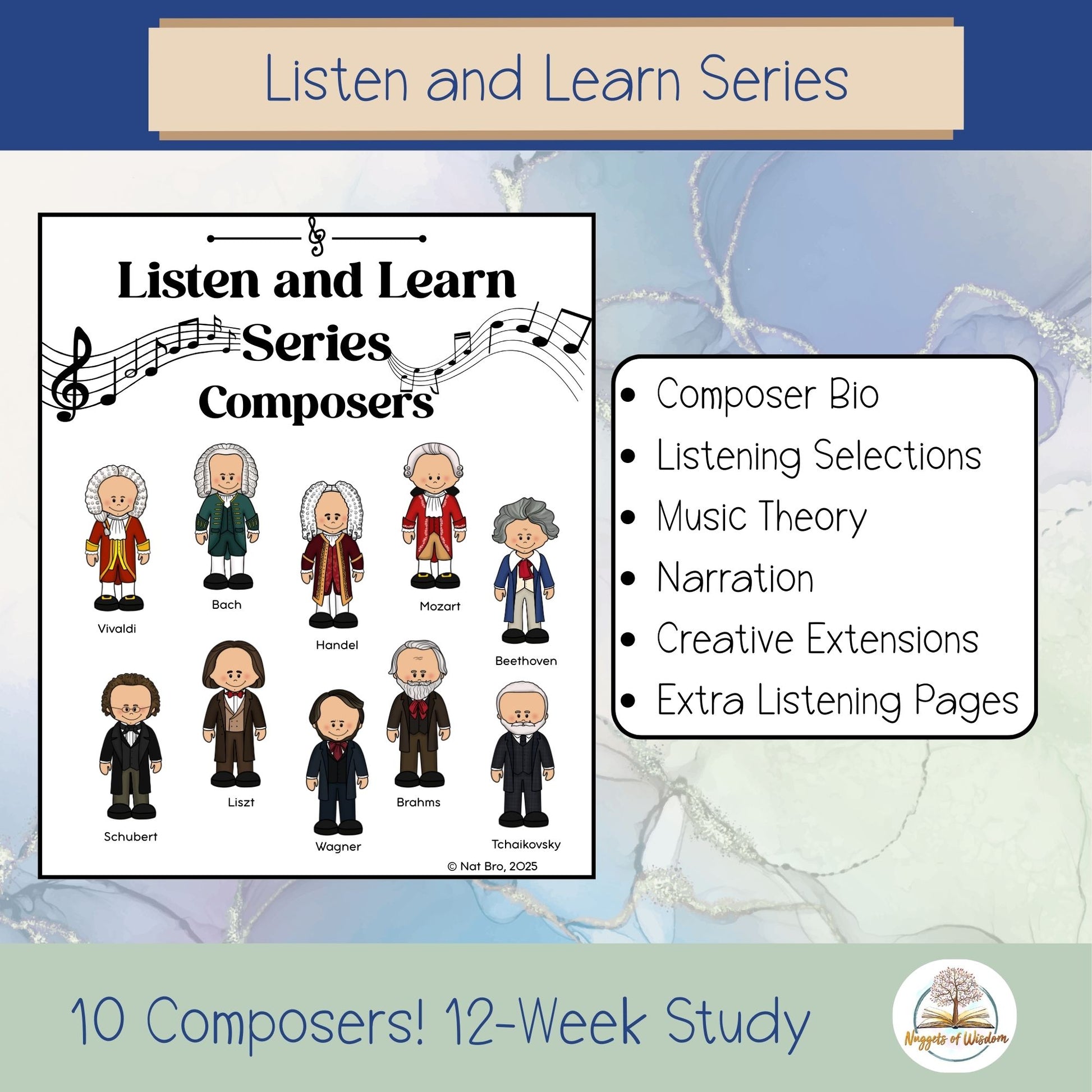 The Listen and Learn Series combines music history, theory, art, narration, and listening in one easy-to-use format that works beautifully for homeschool, classroom, or co-op learning.