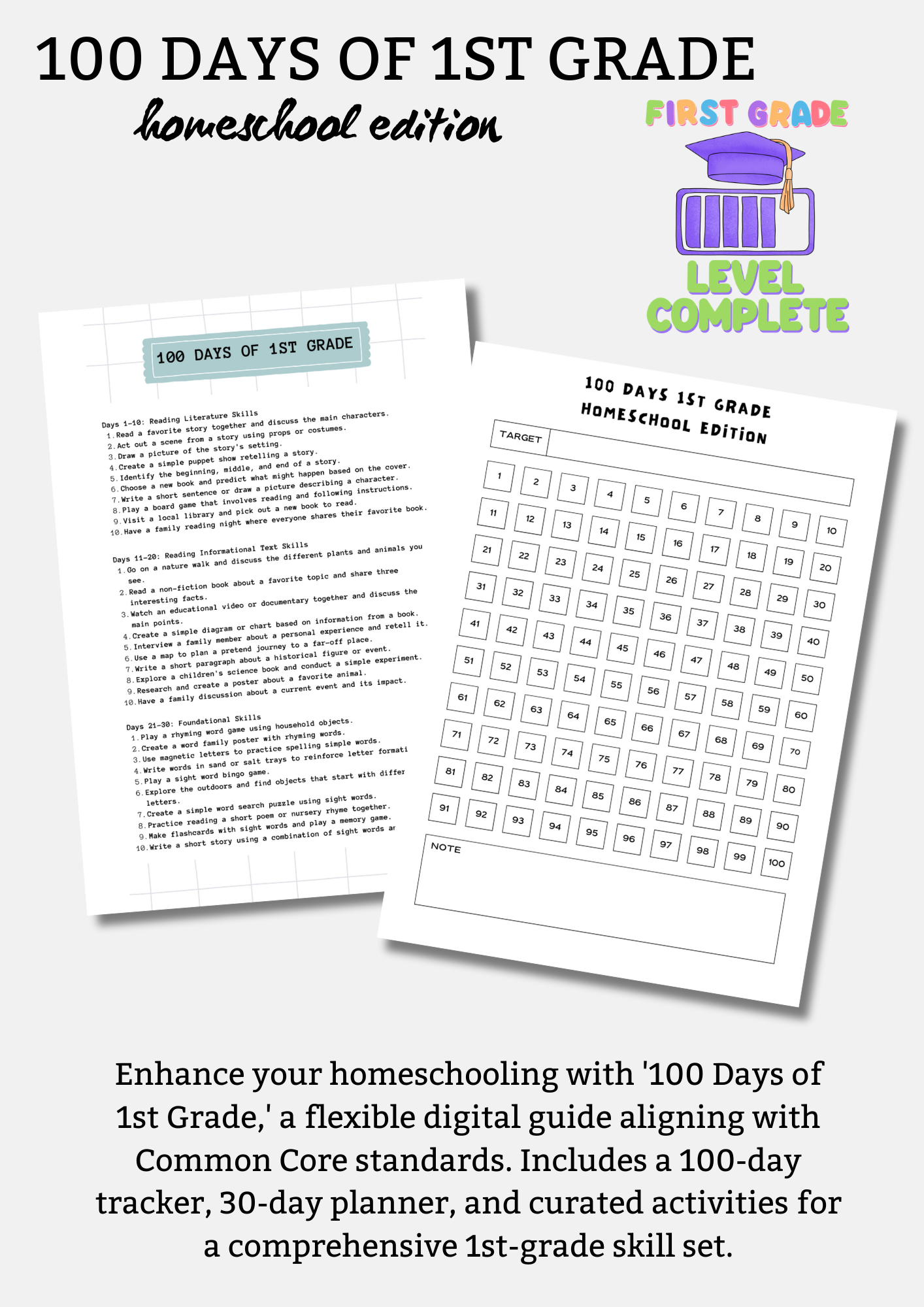 Unlock a personalized and flexible homeschooling journey with our digital download - "100 Days of 1st Grade"! If you find yourself constantly questioned about your child's learning at home or want to keep track of their progress while adhering to common core standards, this product is designed for you.