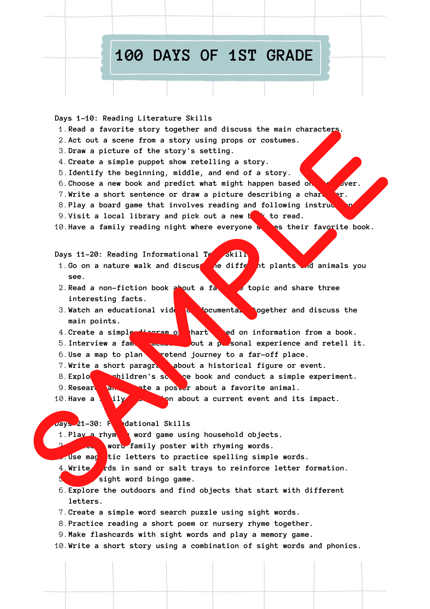 This comprehensive resource translates the Common Core standards for 1st grade into a curated list of engaging activities spanning 100 days. The flexibility is yours - whether you prefer a daily, weekly, or monthly schedule. To make planning seamless, we've included a 100-day tracker and a 30-day planner for your convenience.