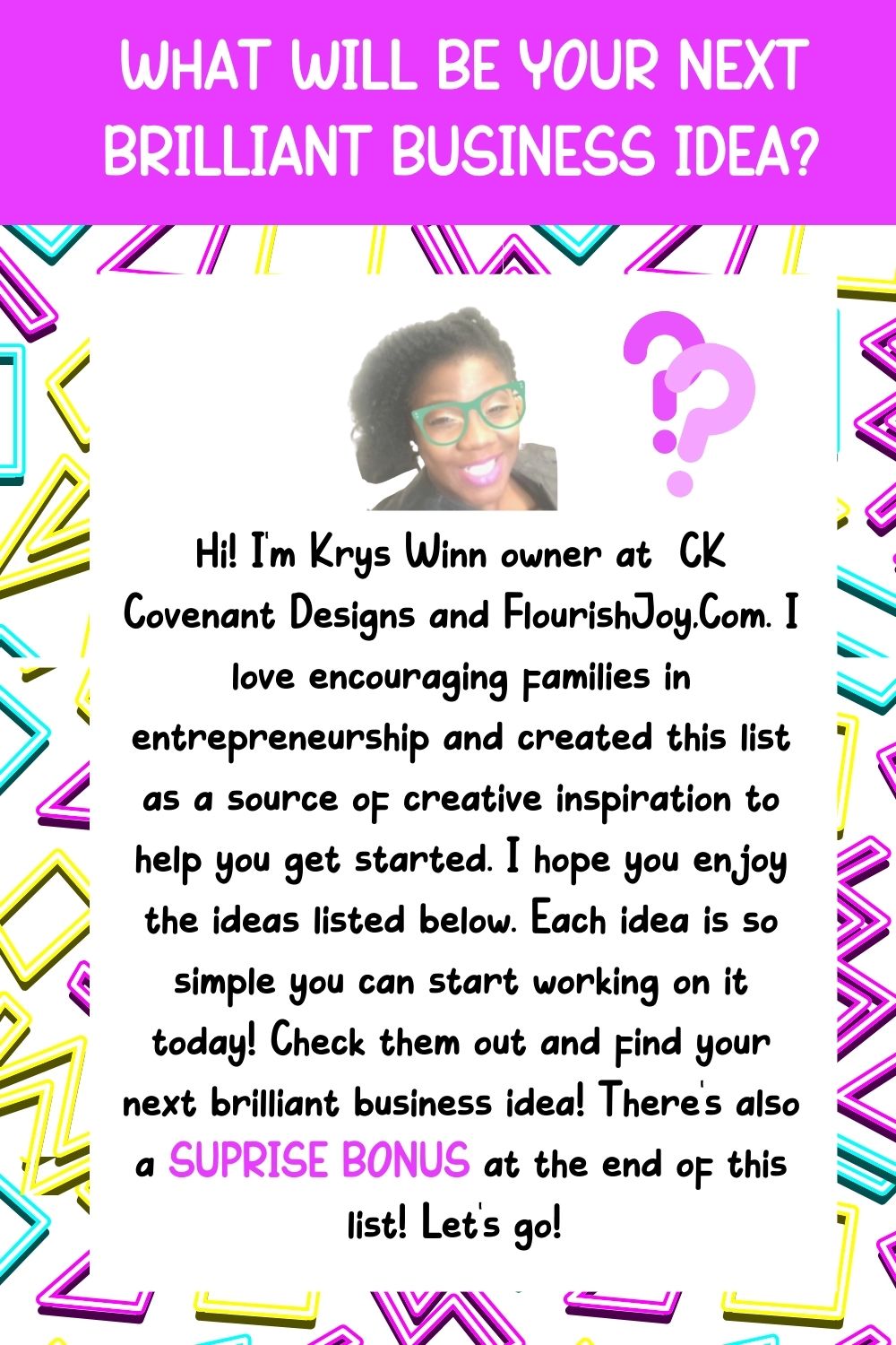 Hi! I’m Krys Winn owner at CK Covenant Designs and FlourishJoy.com. I love encouraging families in entrepreneurship and created this list as a source of creative inspiration to help you get started. I hope you enjoy the ideas listed below. Each idea is so simple you can start working on it today! Check them out and find your next brilliant business idea! There’s also a SURPRISE BONUS at the end of this list! Let’s go!