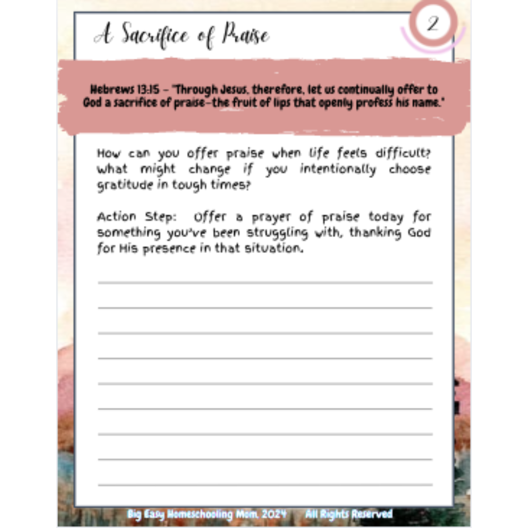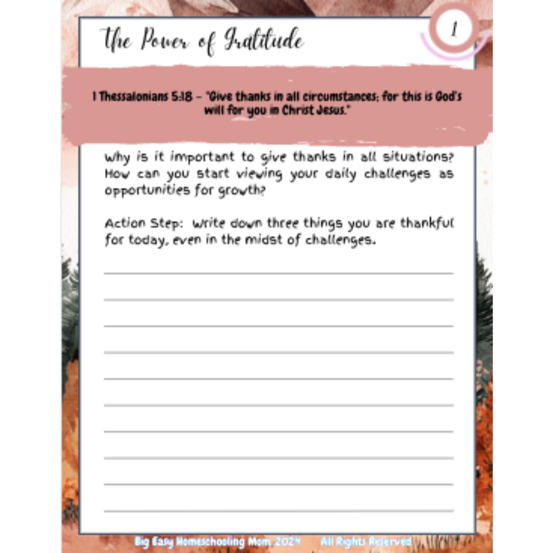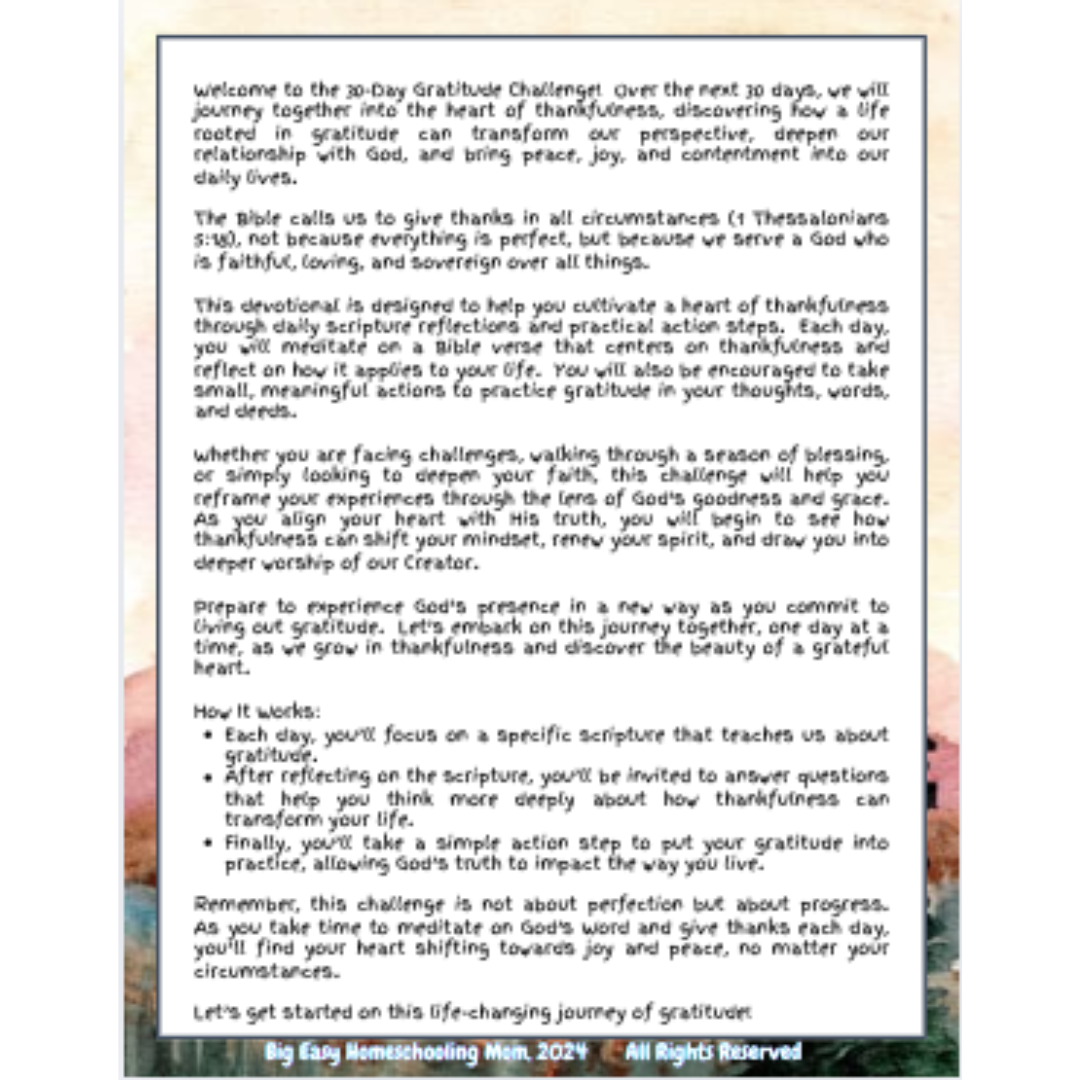 The Gratitude 30-Day Challenge is more than just a devotional—it’s a lifestyle guide that equips students, teachers, and homeschool parents to make thankfulness a cornerstone of their daily lives. By intentionally incorporating gratitude into homes, classrooms, and homeschools, this resource encourages lasting spiritual growth and joy.
