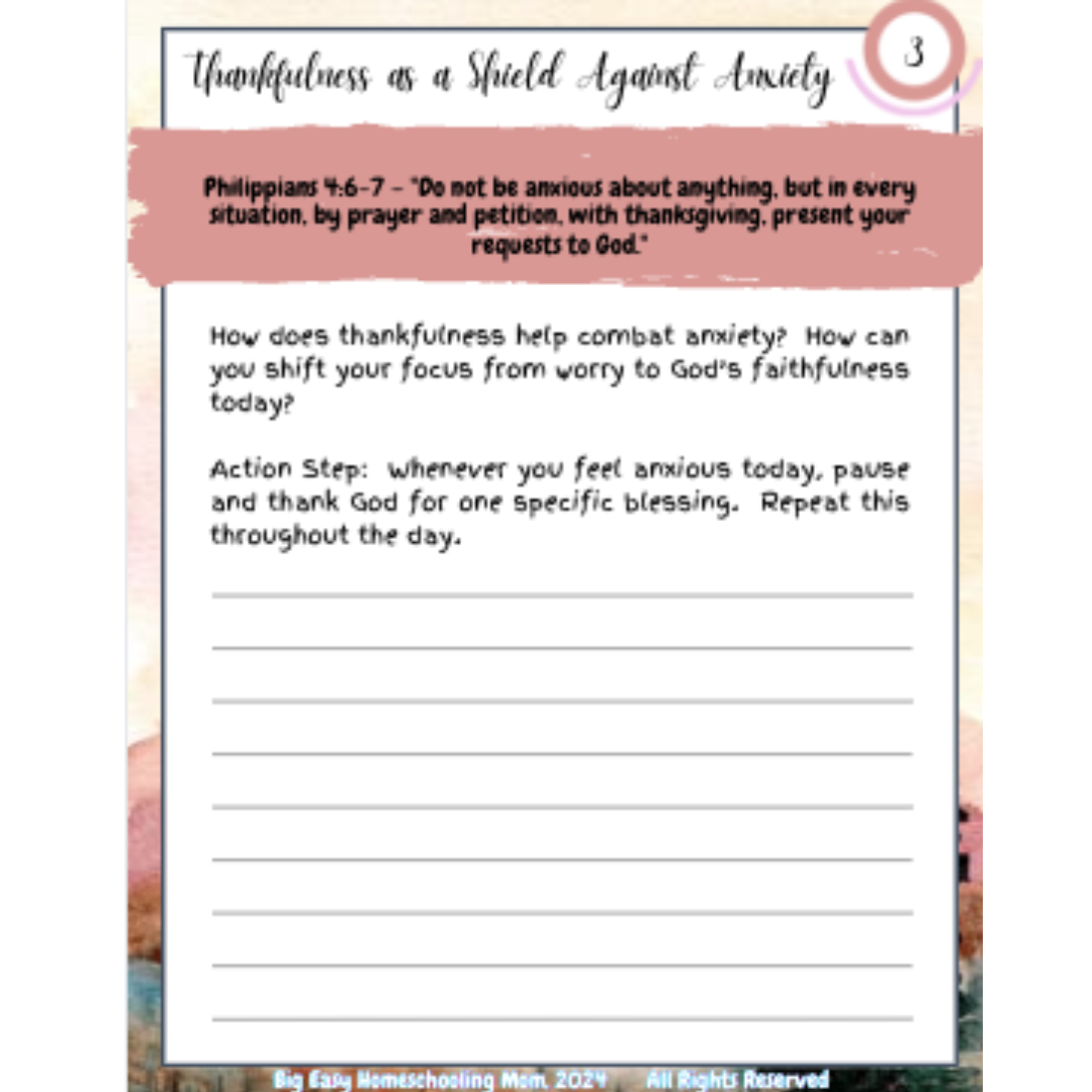 *Biblical Understanding: Deepen their knowledge of gratitude as a core biblical principle. *Emotional Growth: Learn to use thankfulness as a shield against anxiety and negativity. *Personal Reflection: Daily prompts encourage prayer, journaling, and practical action.