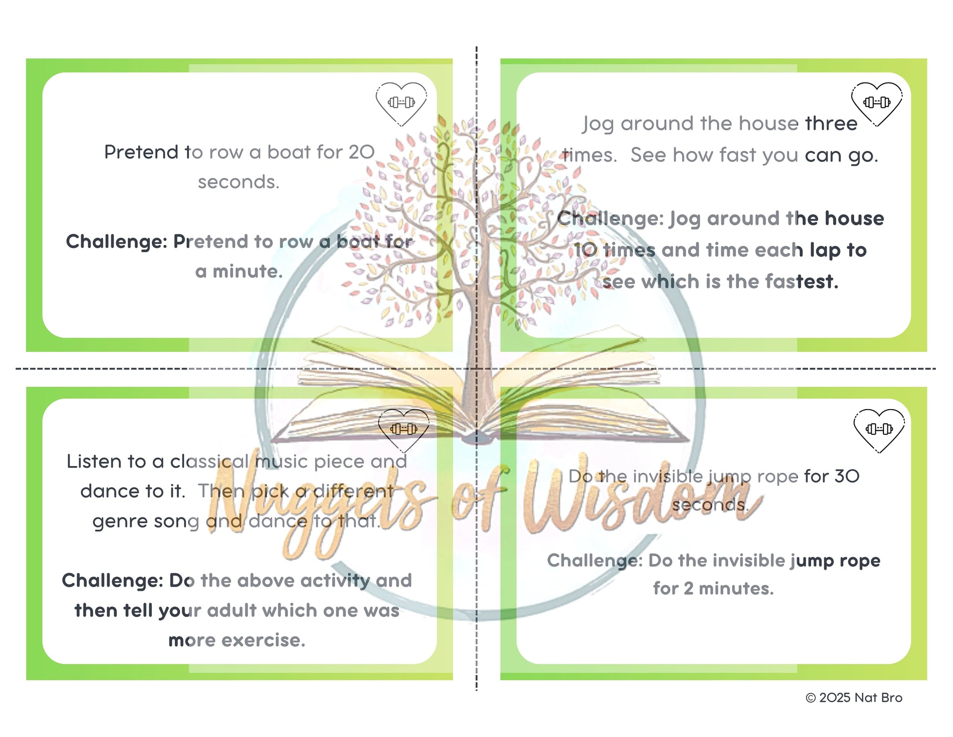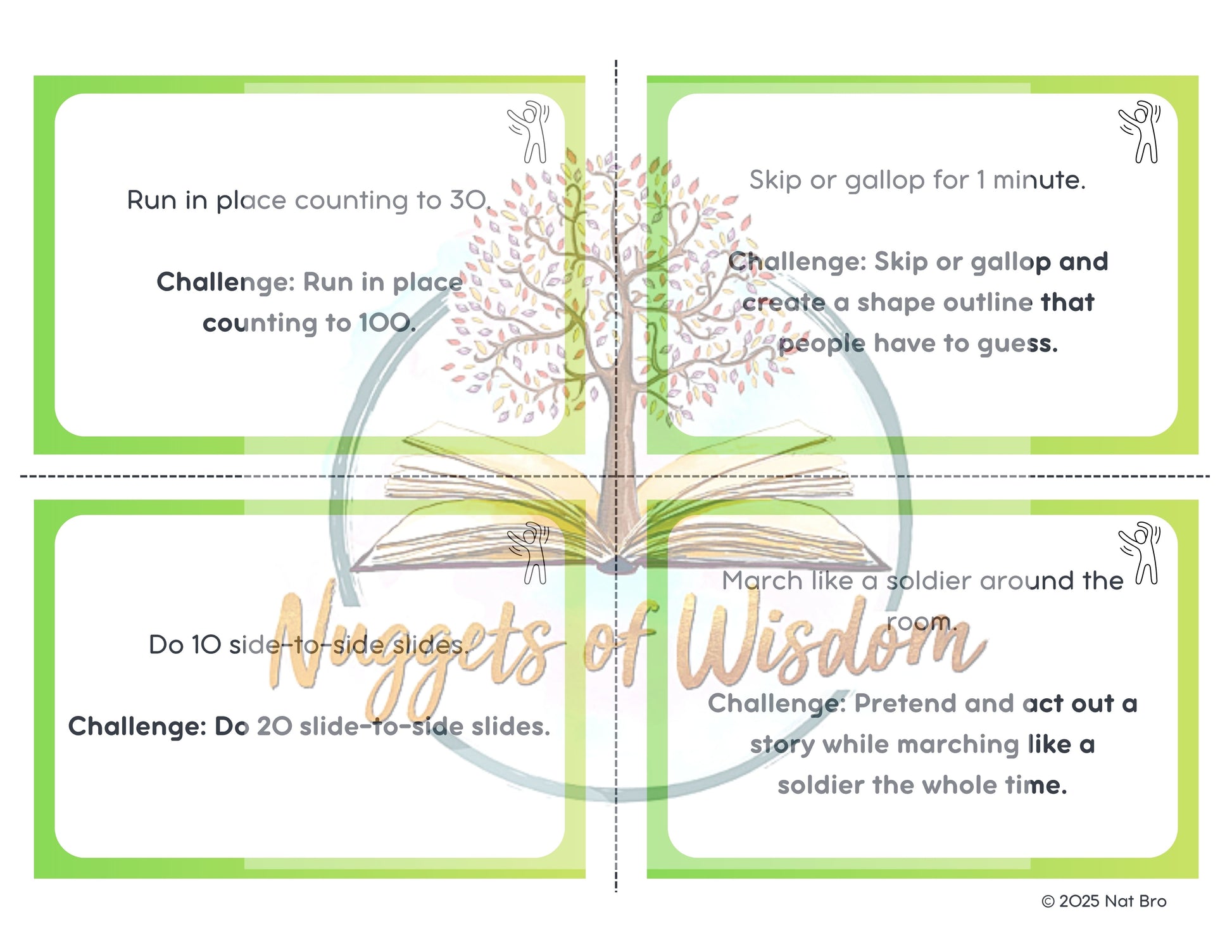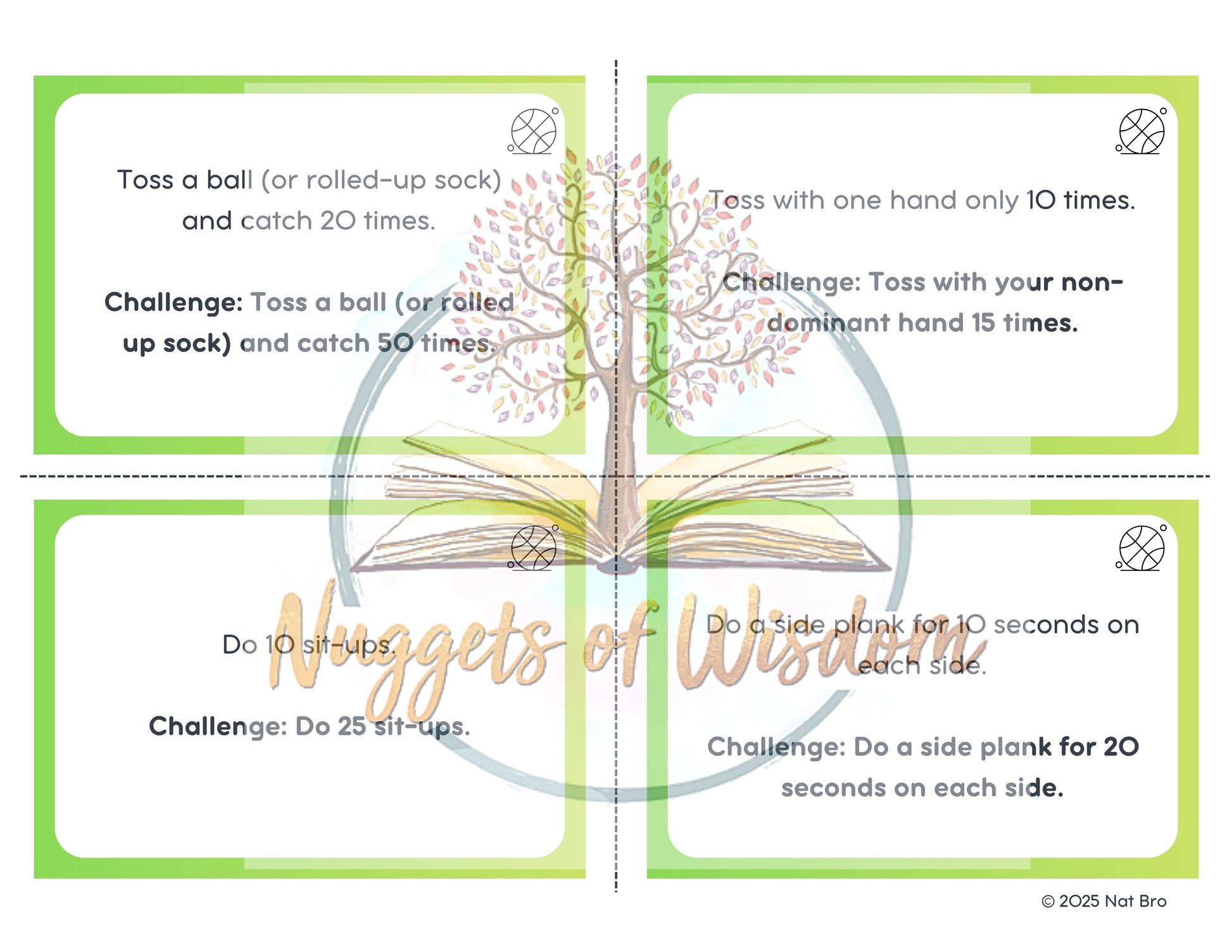 This printable set helps children build coordination, balance, strength, and endurance through simple, no-prep physical activities they can do at home or in small spaces — no special equipment required.