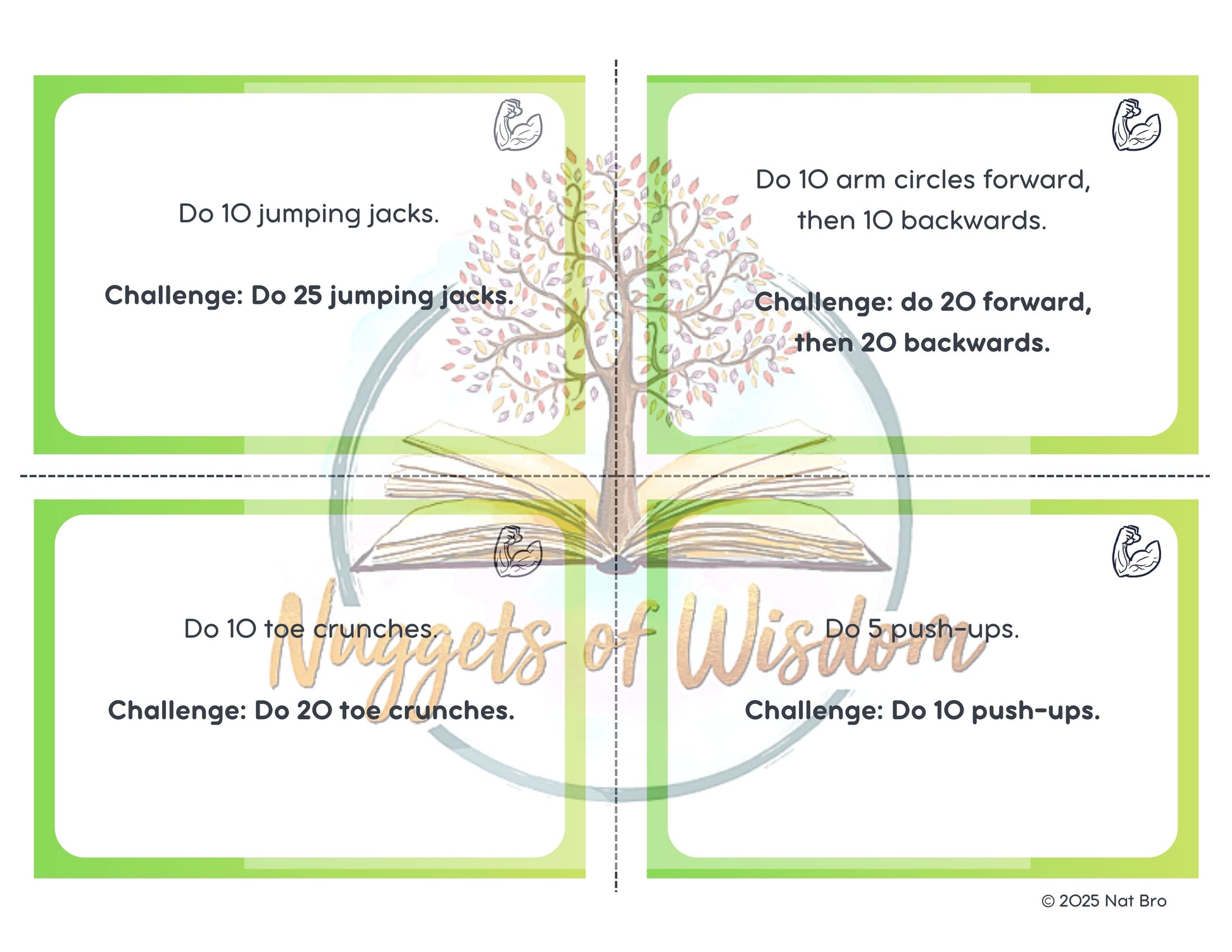 These cards are perfect for homeschool physical education, movement breaks, and daily fitness routines. Whether used during morning time, between lessons, or as part of a weekly PE plan, kids will love moving through fun, achievable exercises that grow with their abilities.