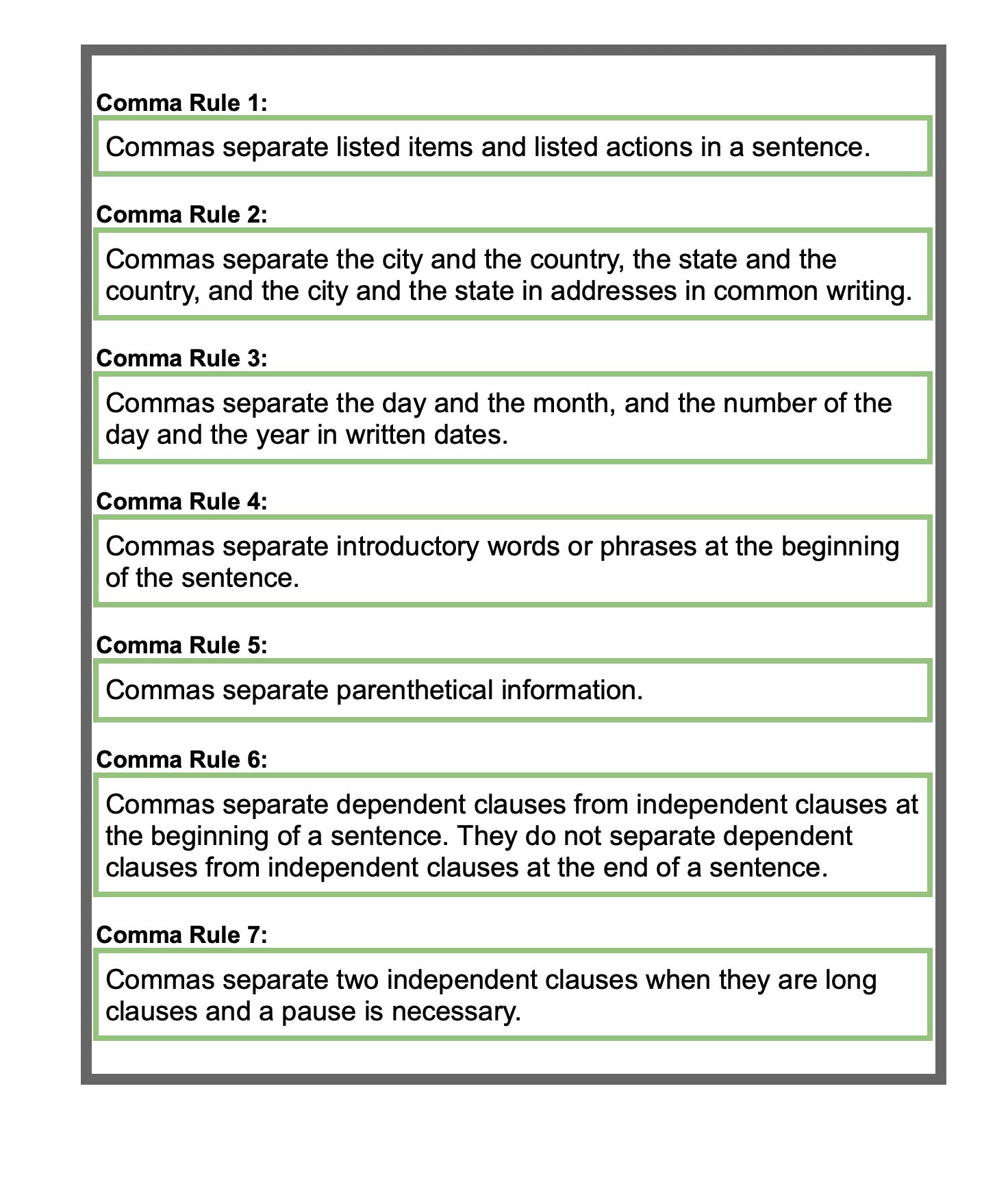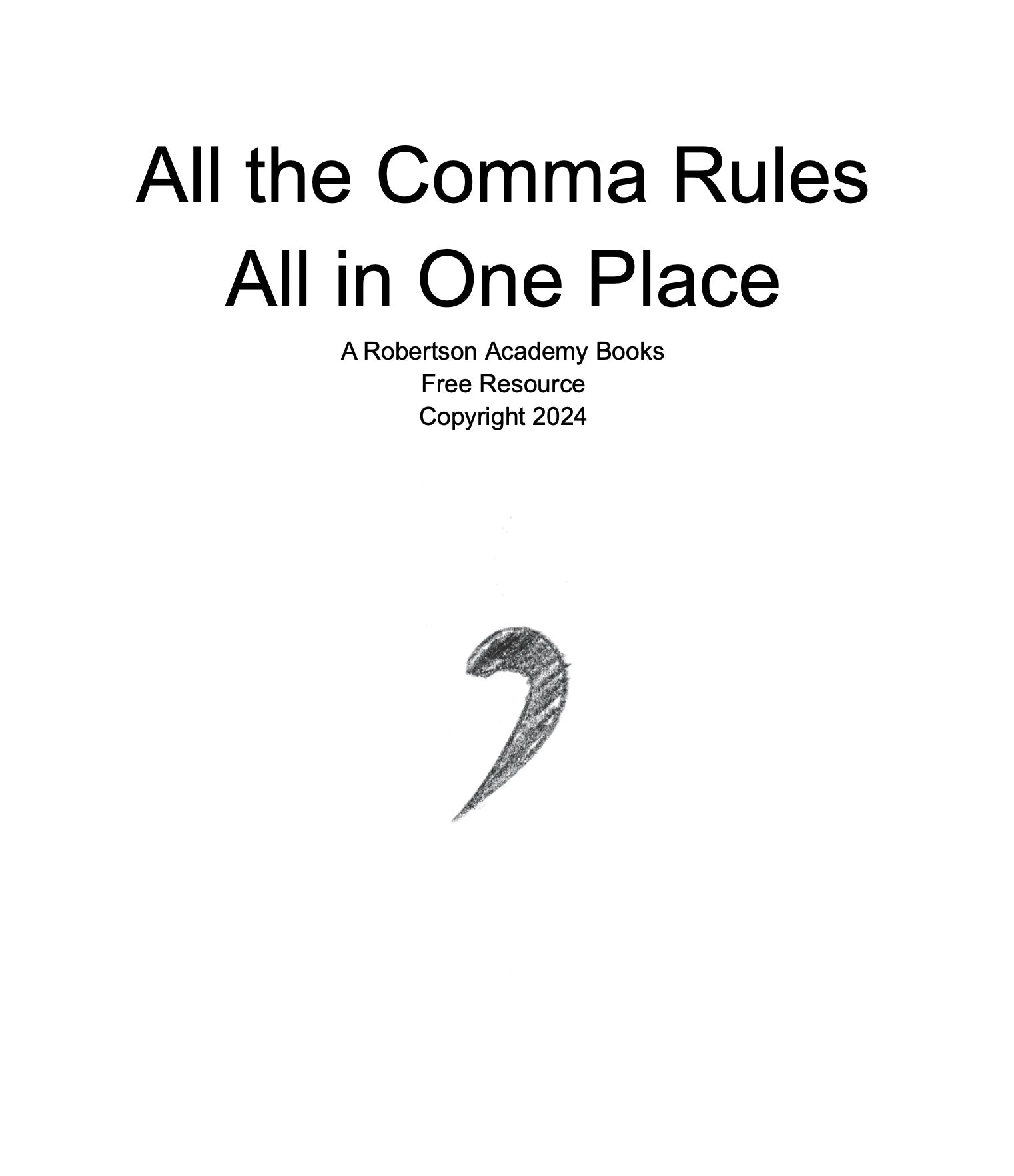 This resource is for advanced students who just need a reminder about when to use commas and a resource for parents who want a list to look at to make sure that have what they need to teach their children how to use commas.