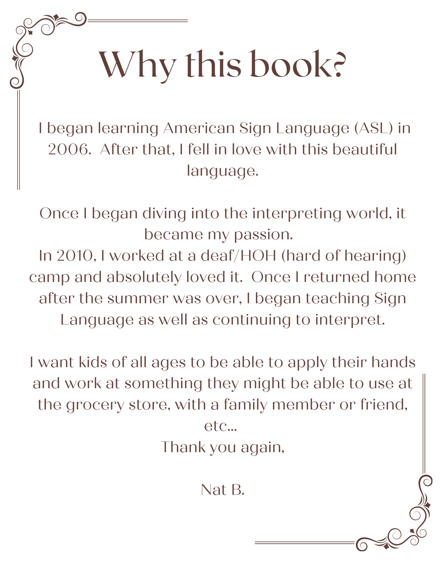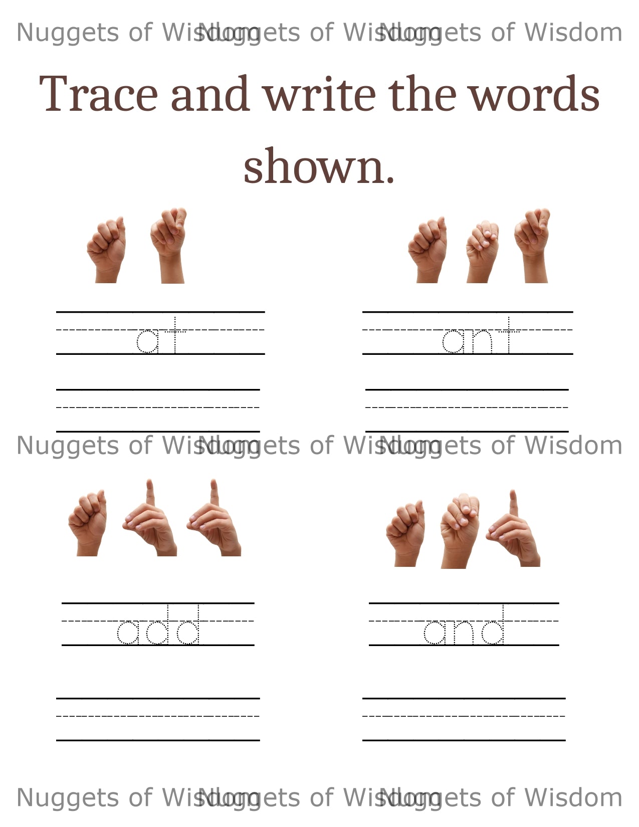 Each letter of the alphabet has 4 pages given to helping learn how to read, trace, write, and fingerspell words in our language.