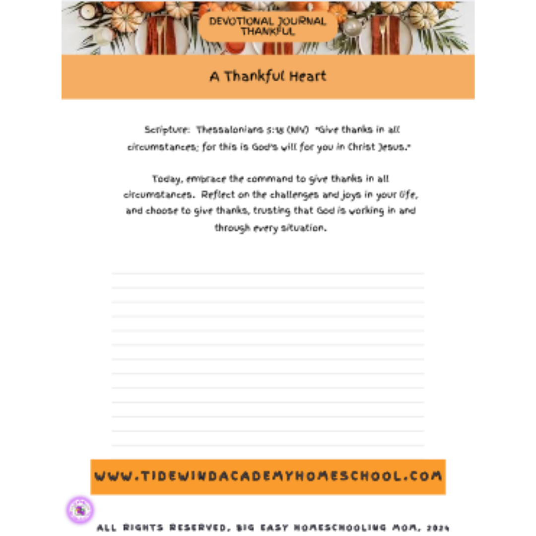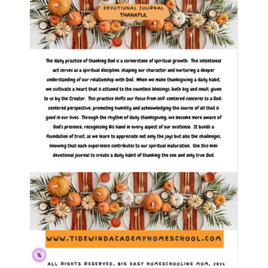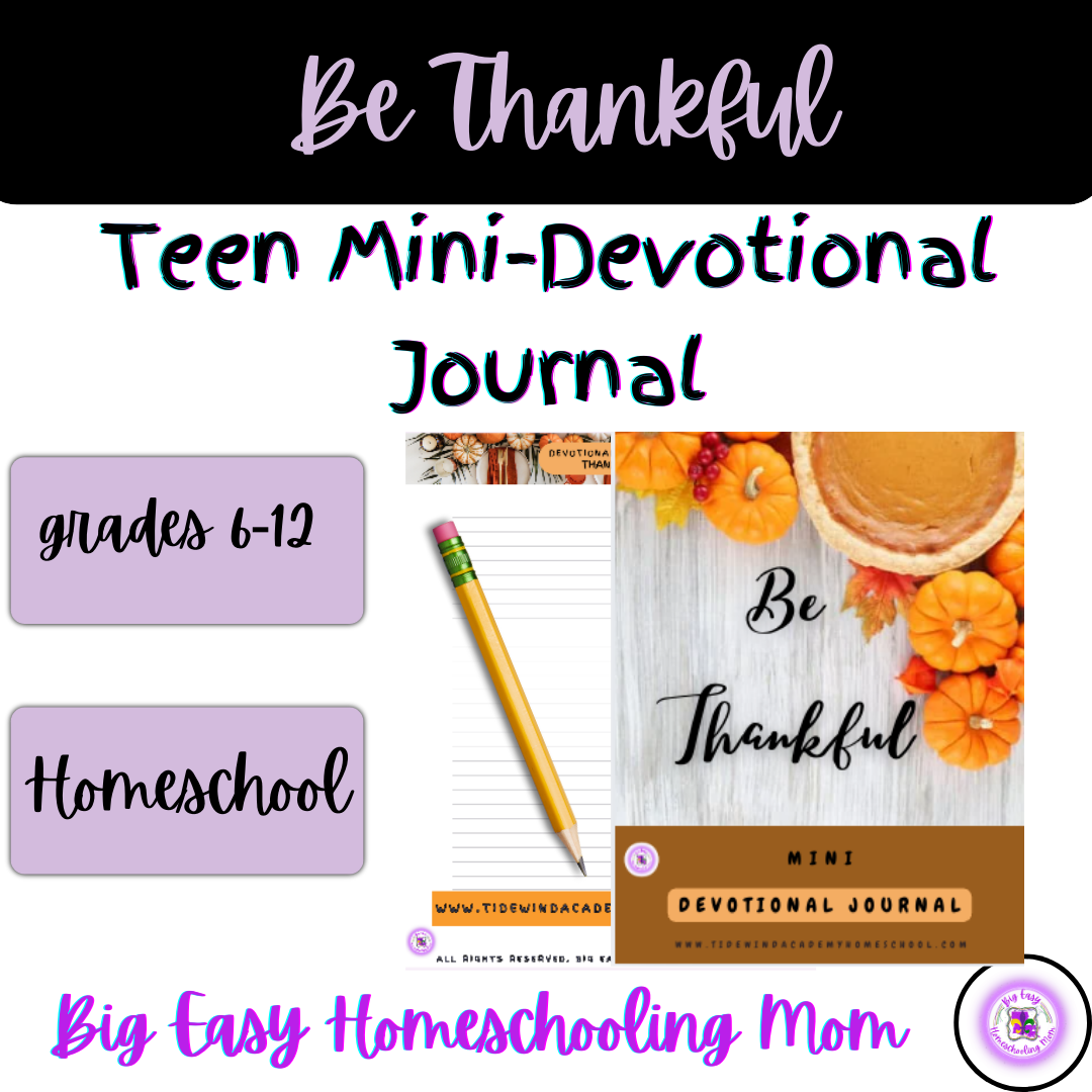 The Be Thankful Teen Mini-Devotional Journal is a transformative resource designed to inspire upper middle to high school students, teachers, and homeschool parents to embrace gratitude every day of the year. With a focus on building faith, character, and mindfulness, this Be Thankful Teen Mini-Devotional Journal explores the beauty and significance of thankfulness across ten profound topics.