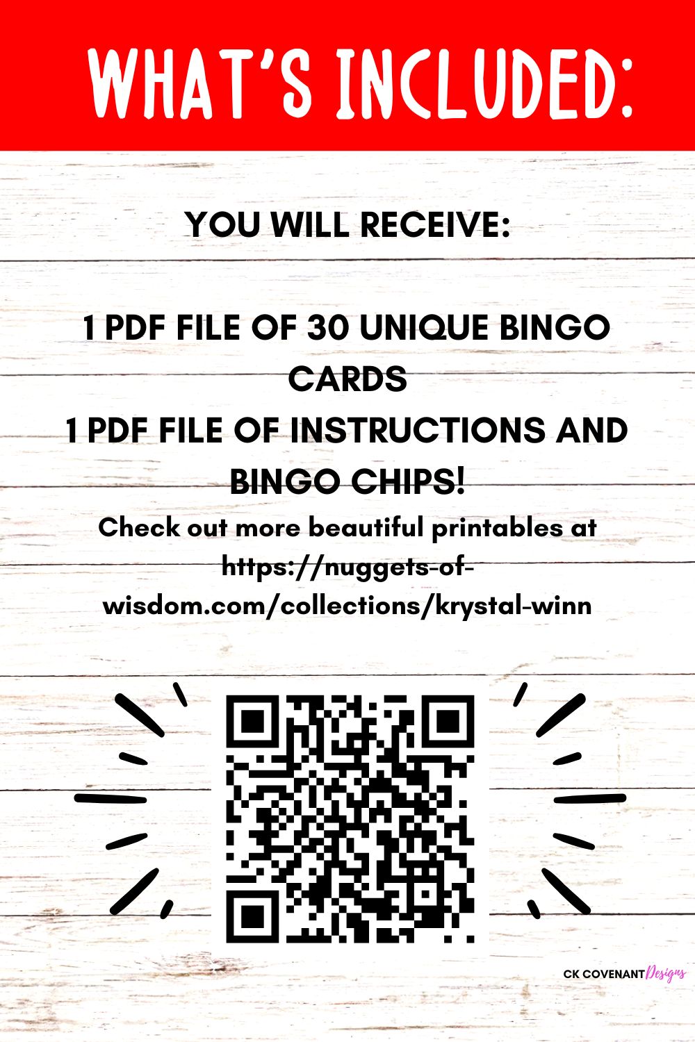 - 1 PDF File of Game play instructions, calling cards, and game chips in two colors!