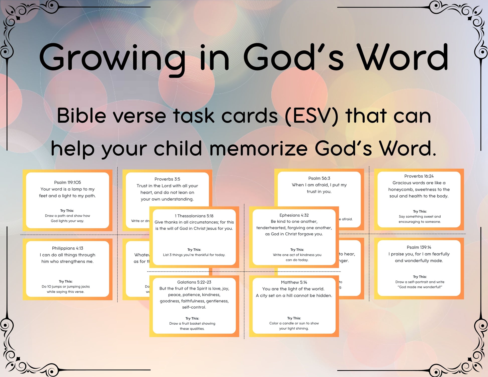 Help your learners hide God’s Word in their hearts with these 50 Bible Verse Task Cards (ESV Edition) — beautifully designed to inspire daily Scripture practice, reflection, and independent learning.