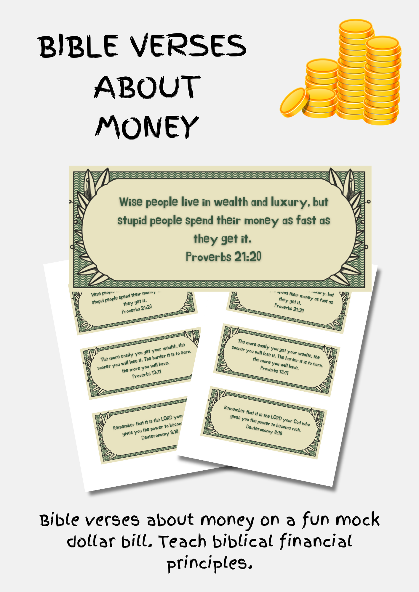 Discover our digital download featuring 15 engaging biblical verses about money! Each verse is creatively designed on a playful mock dollar bill, accompanied by the verse and reference. Dive into the world of financial wisdom with the kid-friendly and easily understandable Good News Translation Bible version.