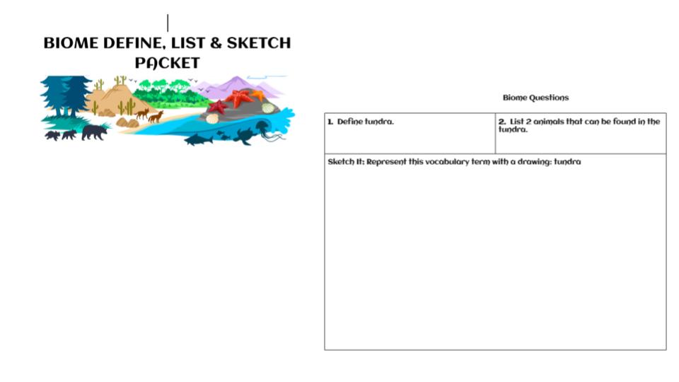 The setup encourages students to define the type of biome first. Then list key facts about the biome. Last, the student will be provided room to sketch the biome adding key components like animals and plants only found in that biome.