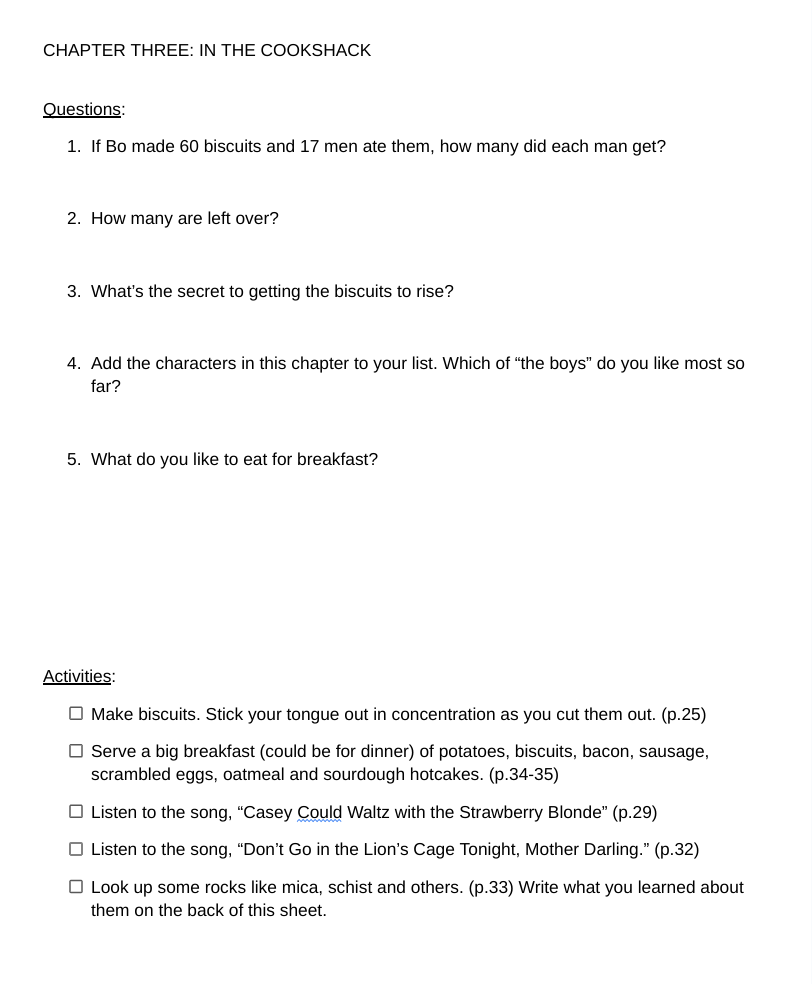 Each chapter includes comprehension questions as well as personal questions that will help the reader feel close to cute little Bo. Each chapter also includes many fun activities to do that will bring the book to life. Your child will get to experience what it's like to be a child living in 1930 Alaska territory.