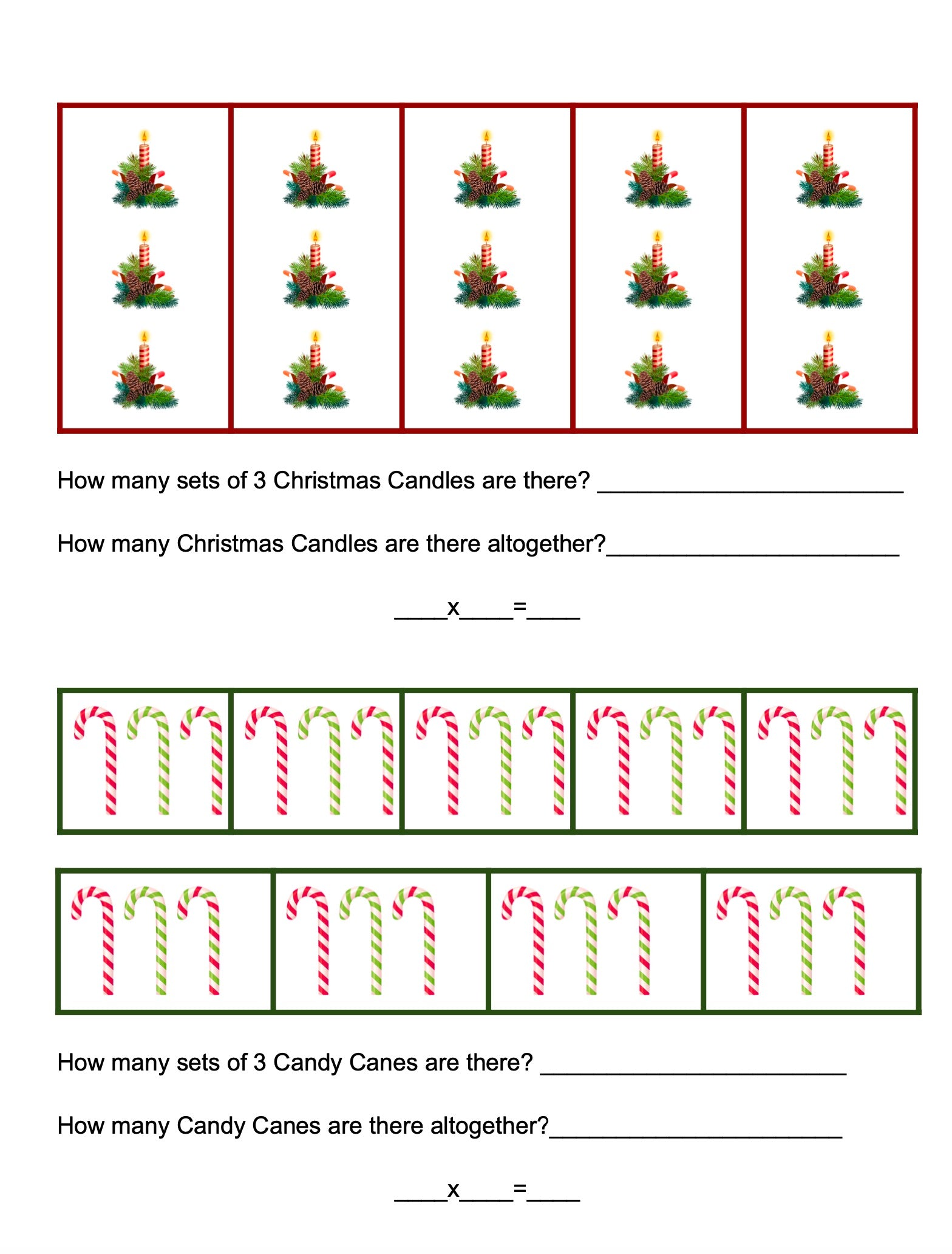 The worksheet consist of counting groups of Christmas Holiday pictures such as Santa and Mrs. Claus, Reindeer, Christmas Trees, Angels, and more. There are problems for counting by 2's, 3's, 4's, and 5's. The student is asked "How many groups of (two, three, four, or five) of the Christmas picture are there?", "How many are there total?", and "________X ________ = ________" .