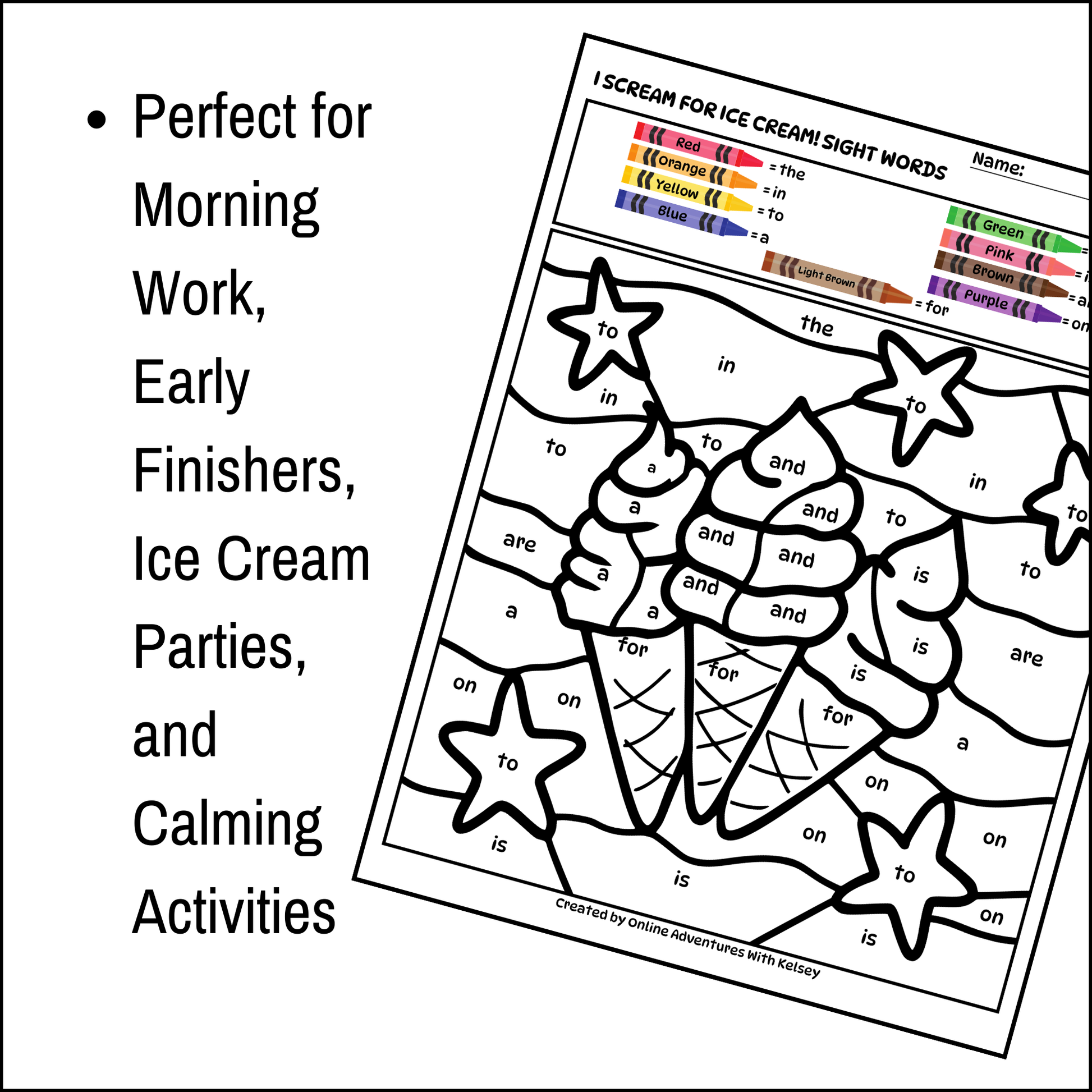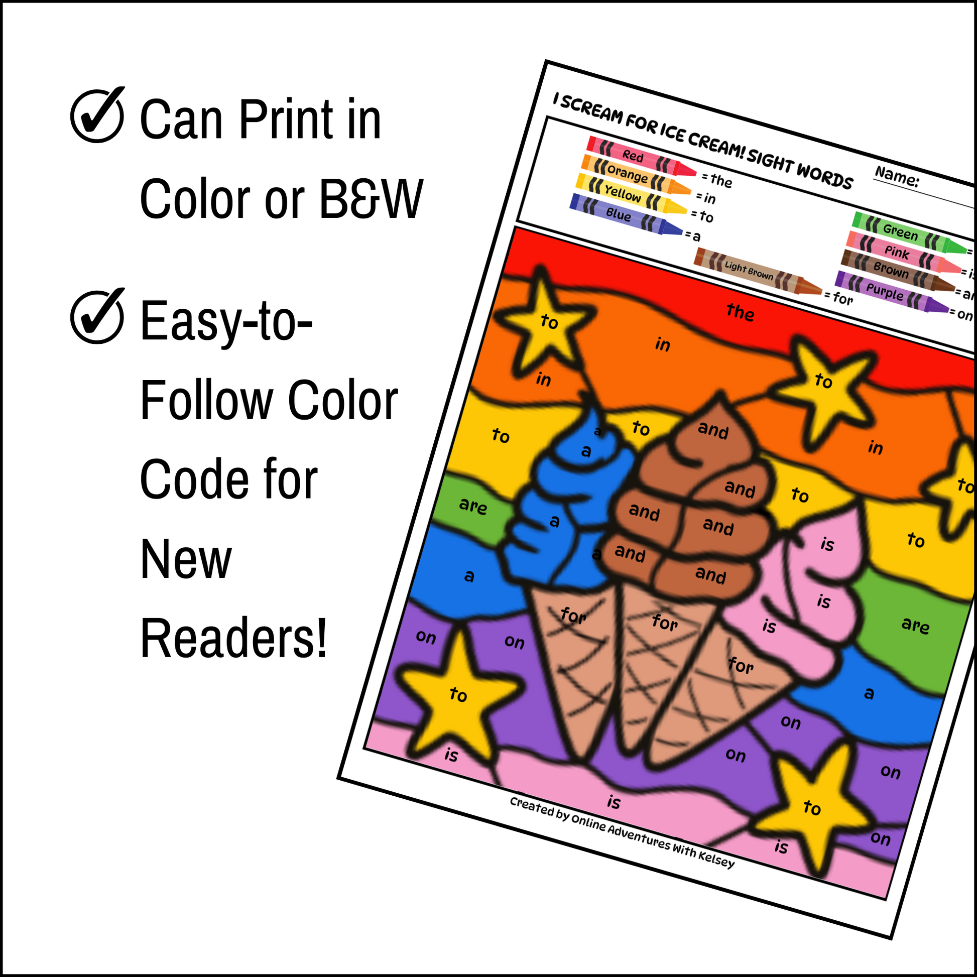This printable sight words worksheet is a fun and engaging color by code activity for students in Kindergarten to 2nd grades. Teachers can use this resource for independent work, Ice Cream Party Activities, or as part of group/center activities. The students will follow the color guide to match colors with the sight words, revealing a colorful picture of ice cream at the end.