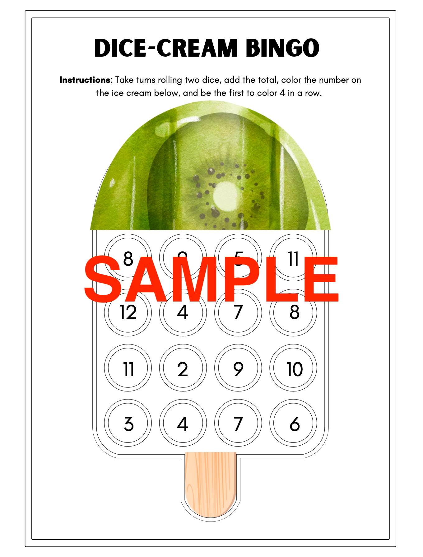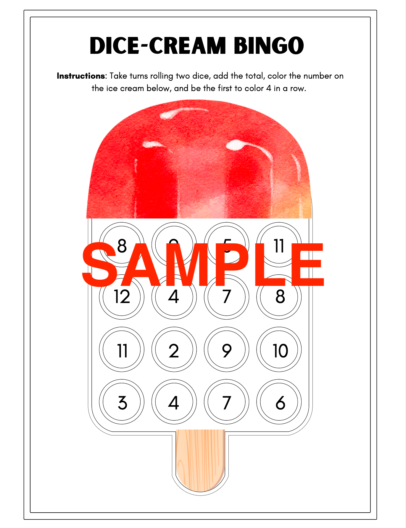 Take turns rolling two dice and coloring in the numbers on your ice cream / popsicle game board. The first person to get 4 in a row wins a Bingo! Students can quickly learn to identify numbers while reading the dice with each turn. They will have fun while practicing addition in this yummy game.