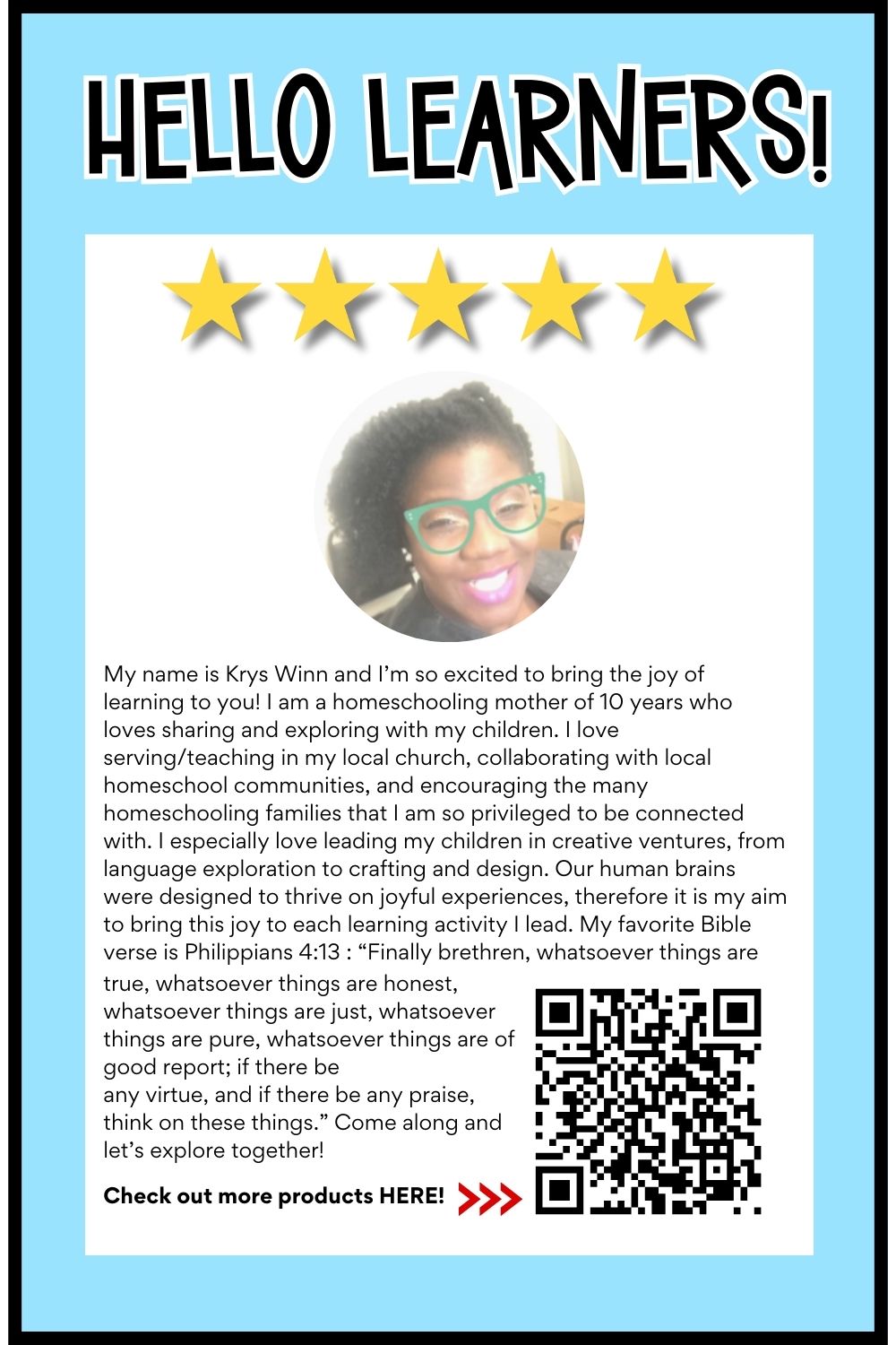 About the Seller: My name is Krys Winn and I’m so excited to bring the joy of learning to you! I am a homeschooling mother of 10 years who loves sharing and exploring with my children. I love serving/teaching in my local church, collaborating with local homeschool communities, and encouraging the many homeschooling families that I am so privileged to be connected with. I especially love leading my children in creative ventures, from language exploration to crafting and design. Our human brains were designed to thrive on joyful experiences, therefore it is my aim to bring this joy to each learning activity I lead. My favorite Bible verse is Philippians 4:13 - “Finally brethren, whatsoever things are true, whatsoever things are honest, whatsoever things are just, whatsoever things are pure, whatsoever things are of good report; if there be any virtue, and if there be any praise, think on these things.” Come along and let’s explore together!