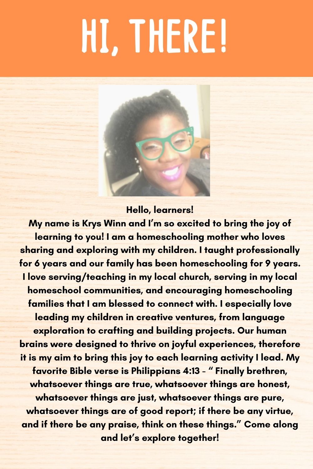 Hello, learners! My name is Krys Winn and I’m so excited to bring the joy of learning to you! I am a homeschooling mother who loves sharing and exploring with my children. I taught professionally for 6 years, and our family has been homeschooling for 9 years.