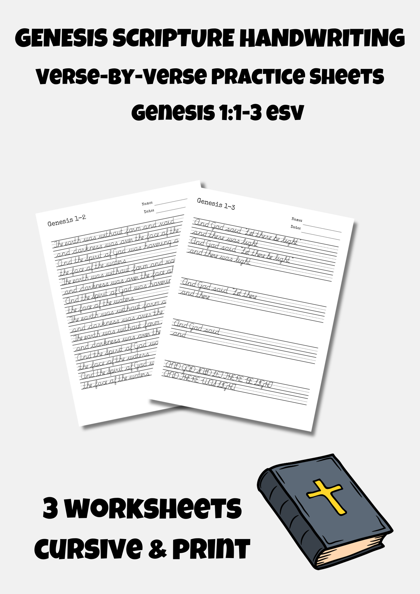 Featuring verses 1-3 from Genesis Chapter 1 in the ESV version, each worksheet encapsulates a single verse, allowing for focused memorization and handwriting practice. Students will read, copy, and then fill in the missing words, fostering memory retention and strengthening their penmanship simultaneously.