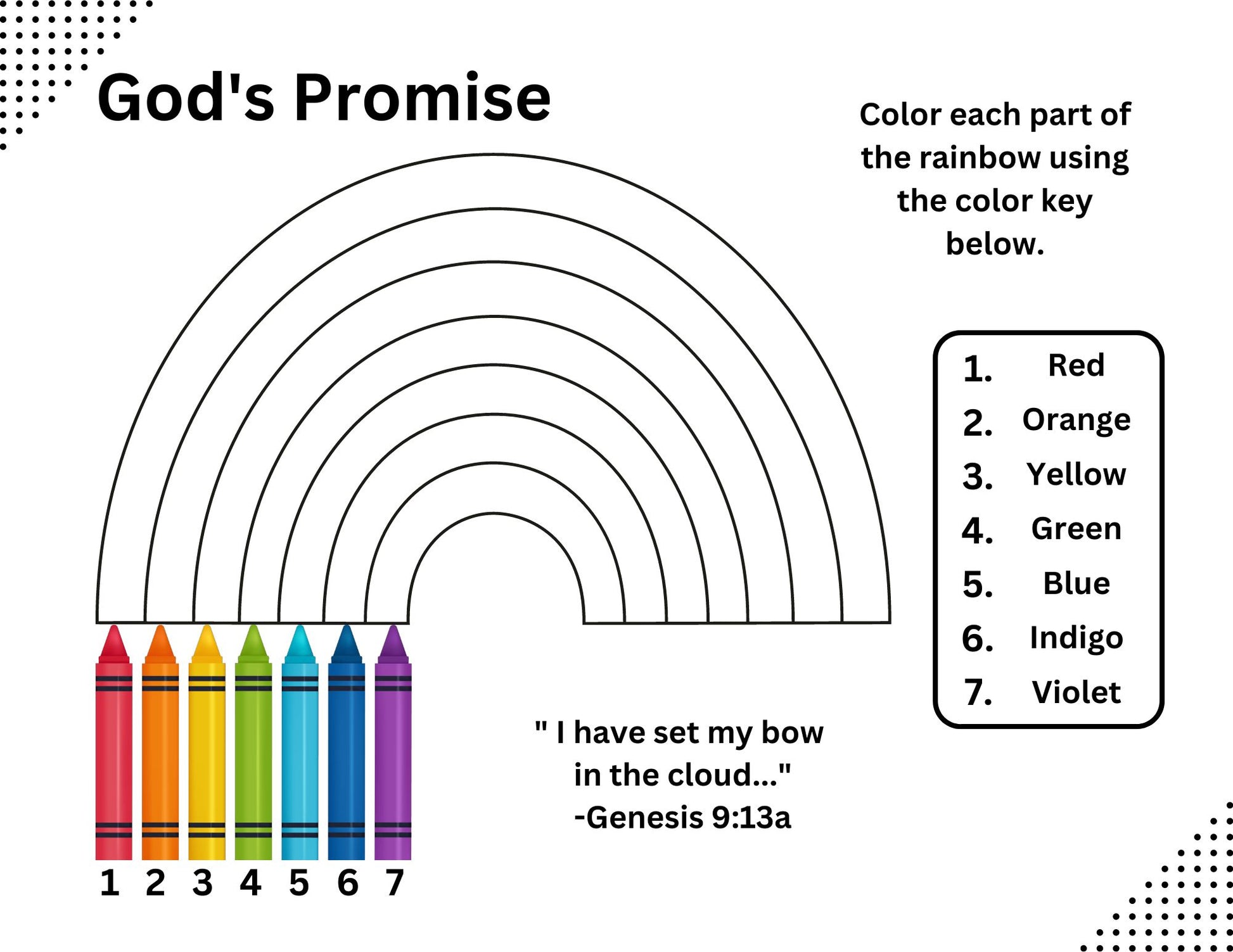 This short activity will help kids learn the colors of the rainbow. They can also color while you read or tell the story of the flood and God's promise after.