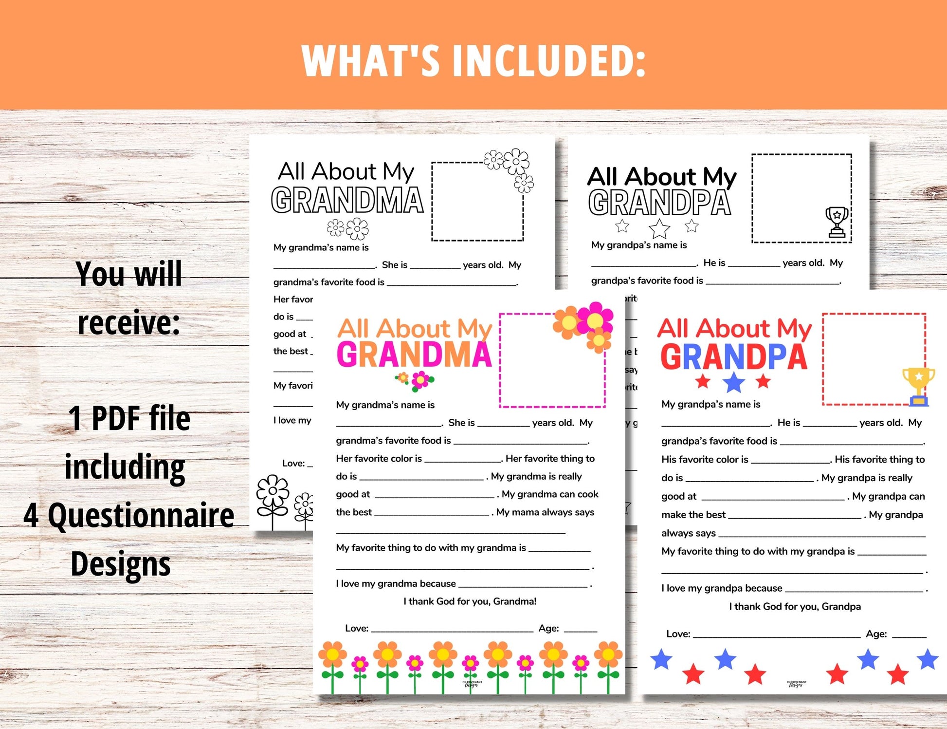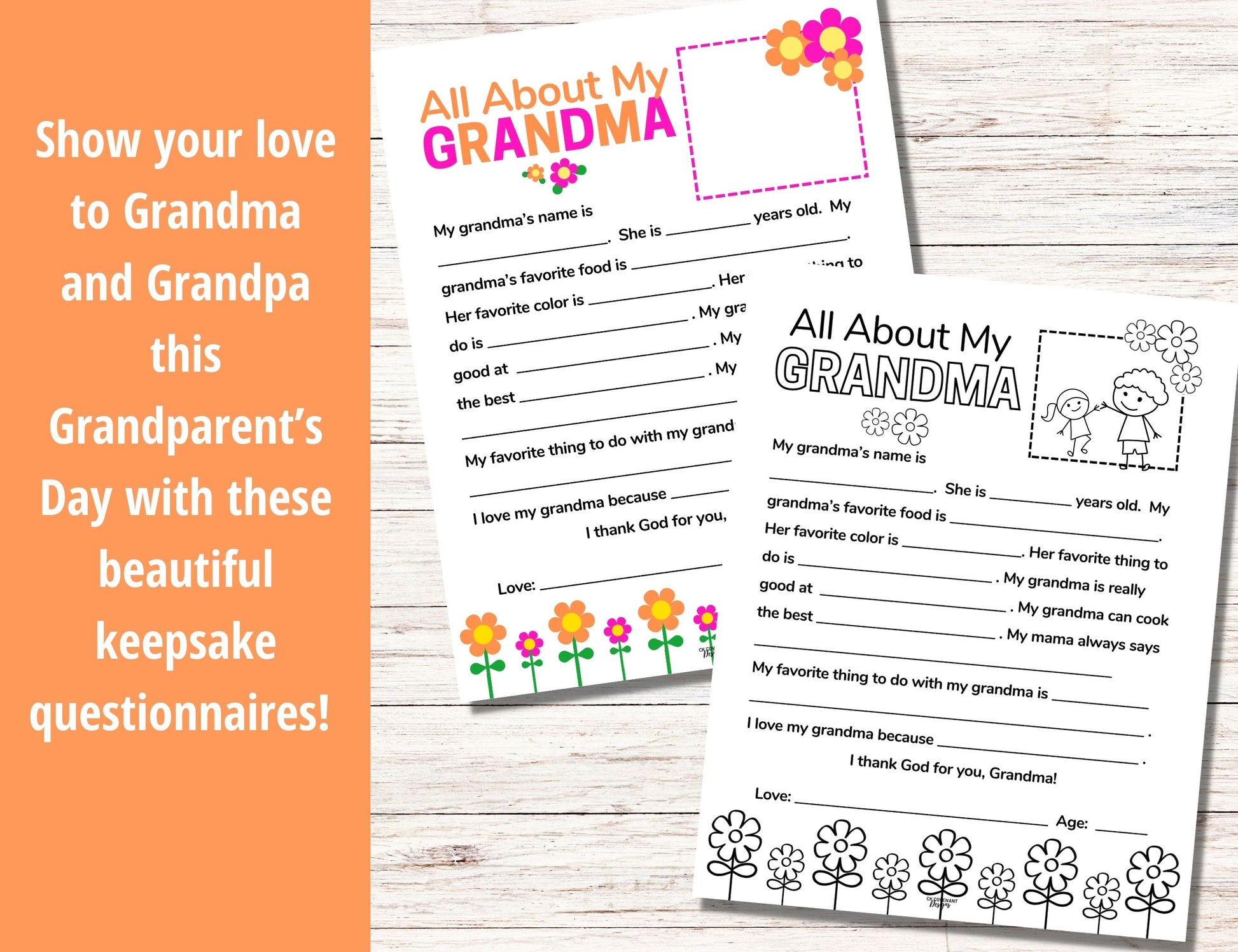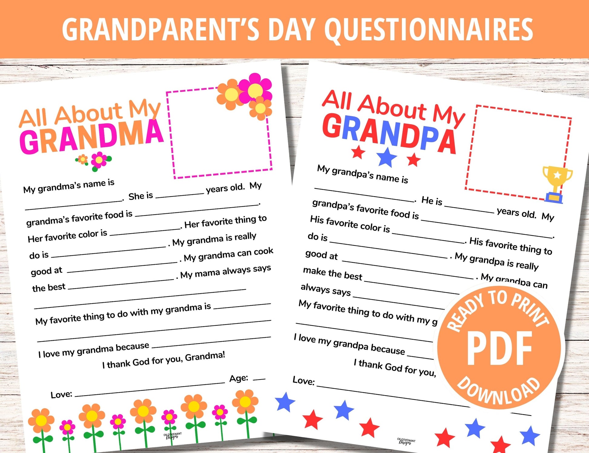 Give the gift of delight this Grandparent's Day with these beautiful, print-ready Grandparent's Day Questionnaires. Including templates for both Grandma and Grandpa, this fun, customizable gift for grandparents includes full- colored and black and white designs!