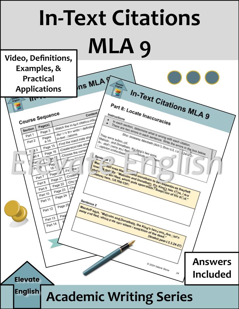 “In-Text Citations MLA 9” is an installment of Elevate English's Academic Writing Series, designed to make writing clear and accessible to all learners! Future guides designed to support literary analysis writing will likely include various scaffolding tools and organizers to assist students in structuring their essays and developing their analytical skills. Enroll in "In-Text Citations MLA 9" today, and begin the academic writing adventure!