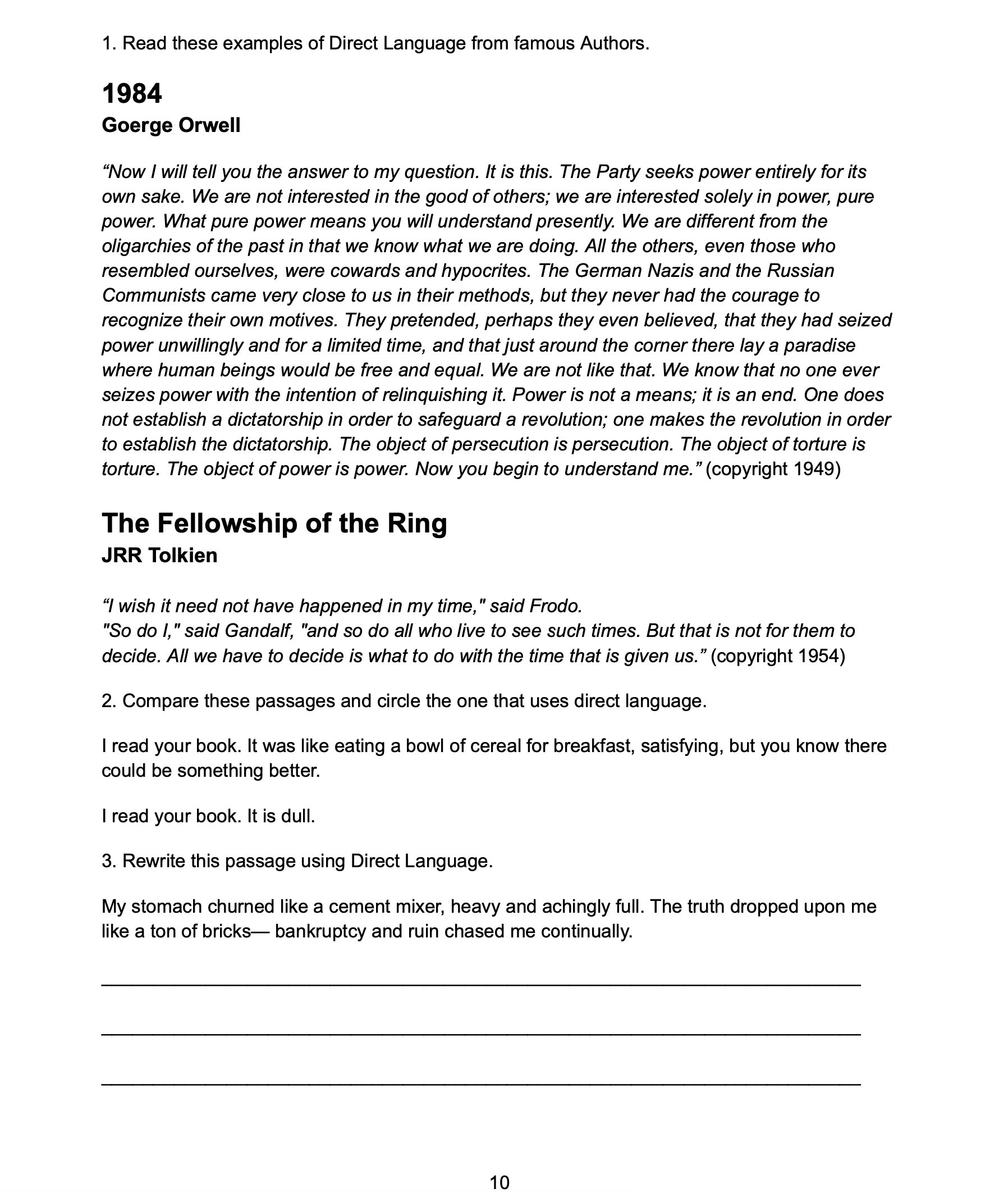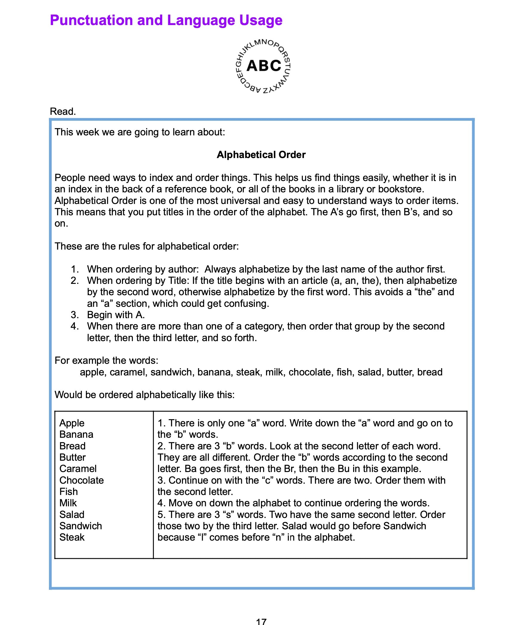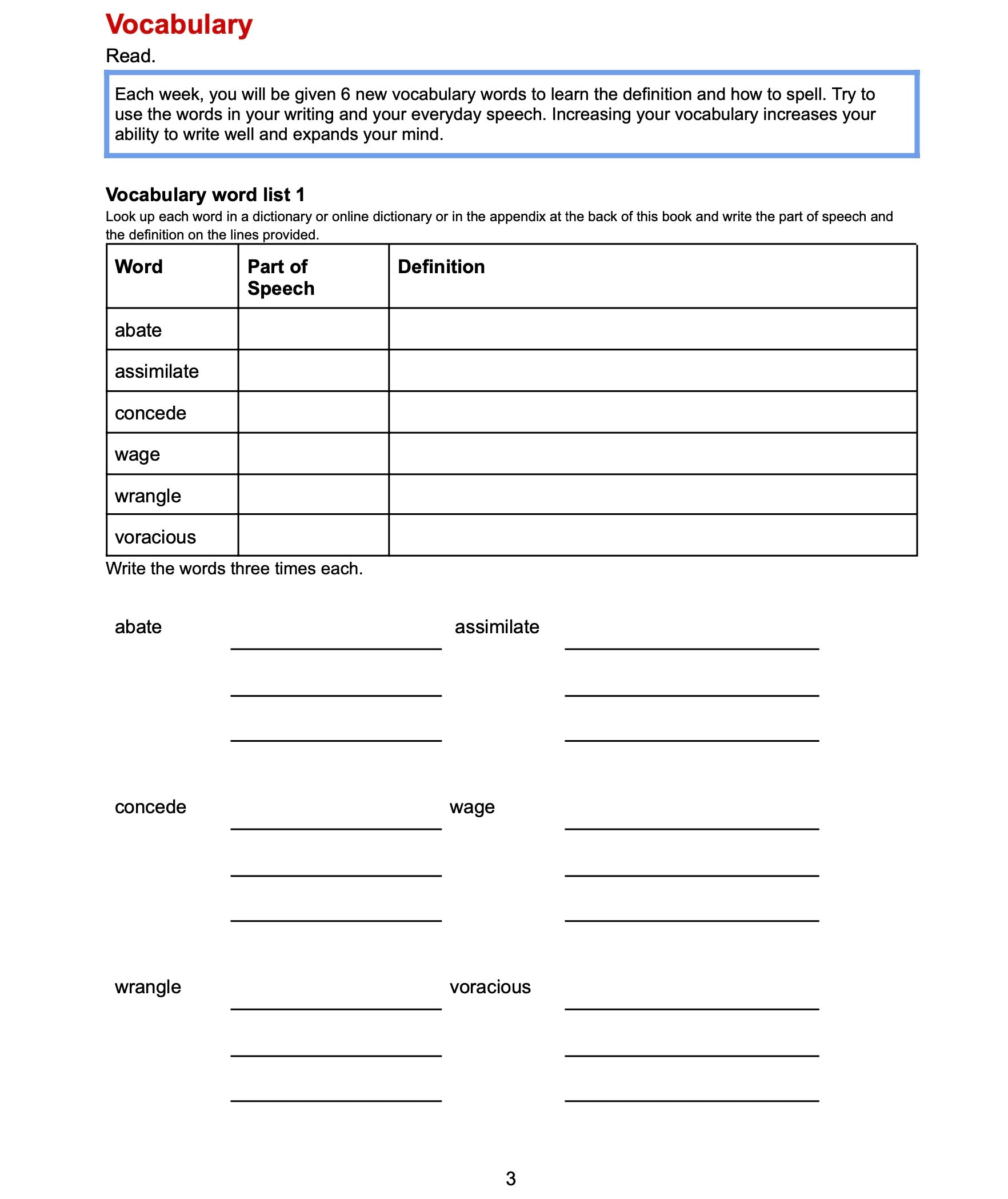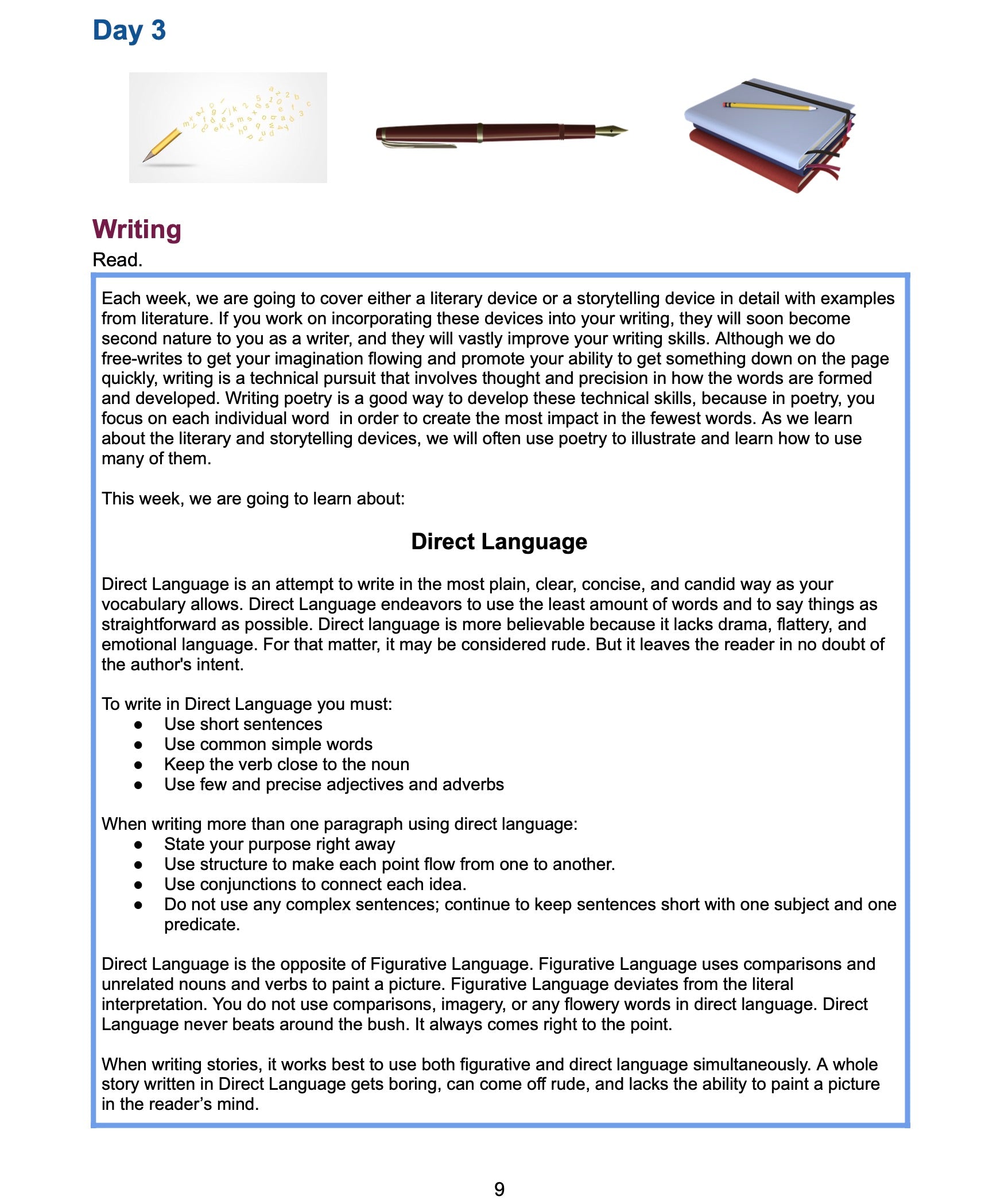This curriculum is well-organized and covers the entire school year with 32 weeks of work/5 days a week. The detailed lessons cover grammar, punctuation, analytical questions, vocabulary, and writing. Since this curriculum is for creative writing 5 days a week, Monday = 10 minutes free write, Tuesday has various writing activities focusing on vocabulary, Wednesday focuses on literature and story-telling, Thursday focuses on plot and constructing a mini novel, and Friday focuses on journal writing.