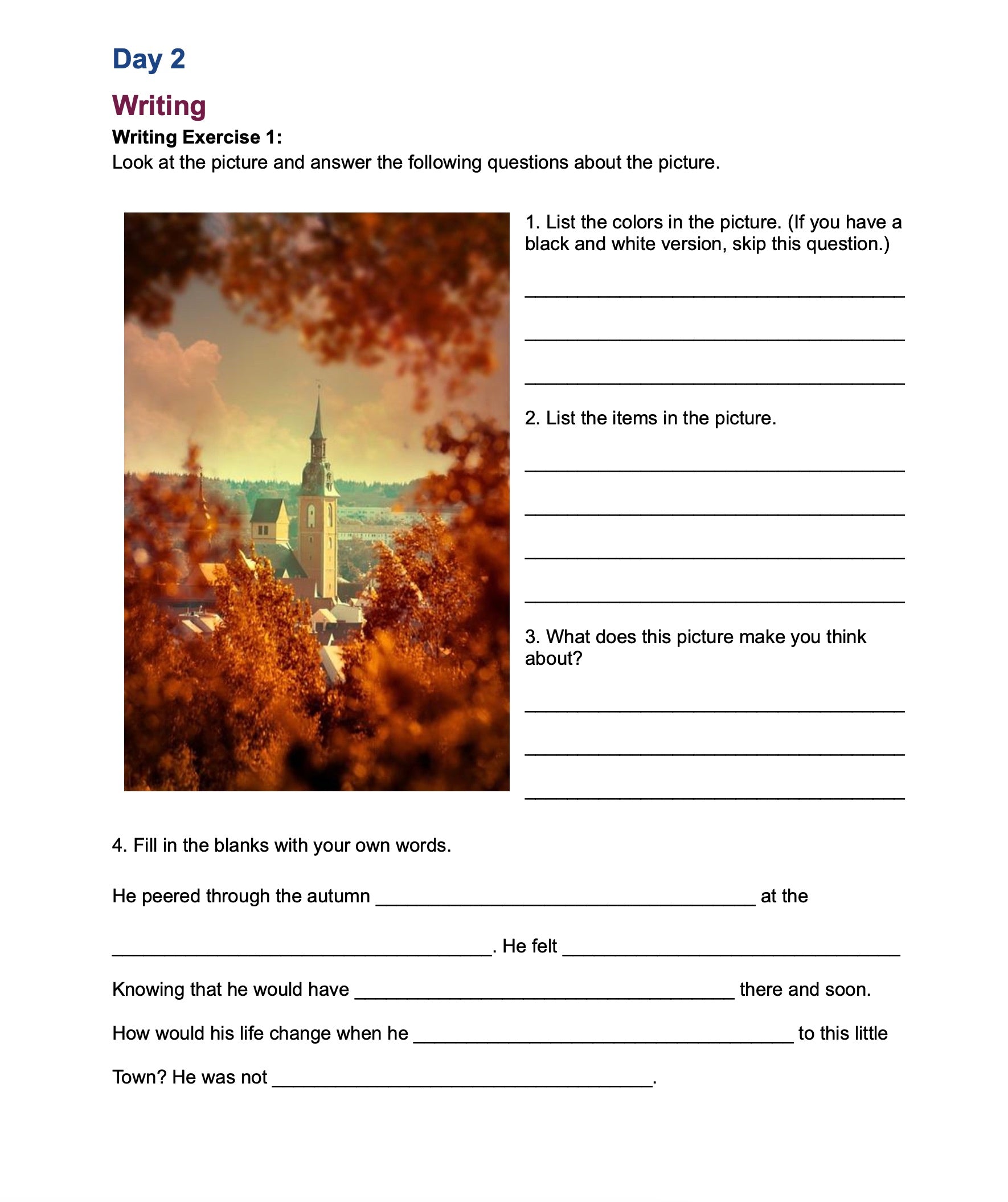 - Day two has various writing activities designed to teach thoughtful word choice.