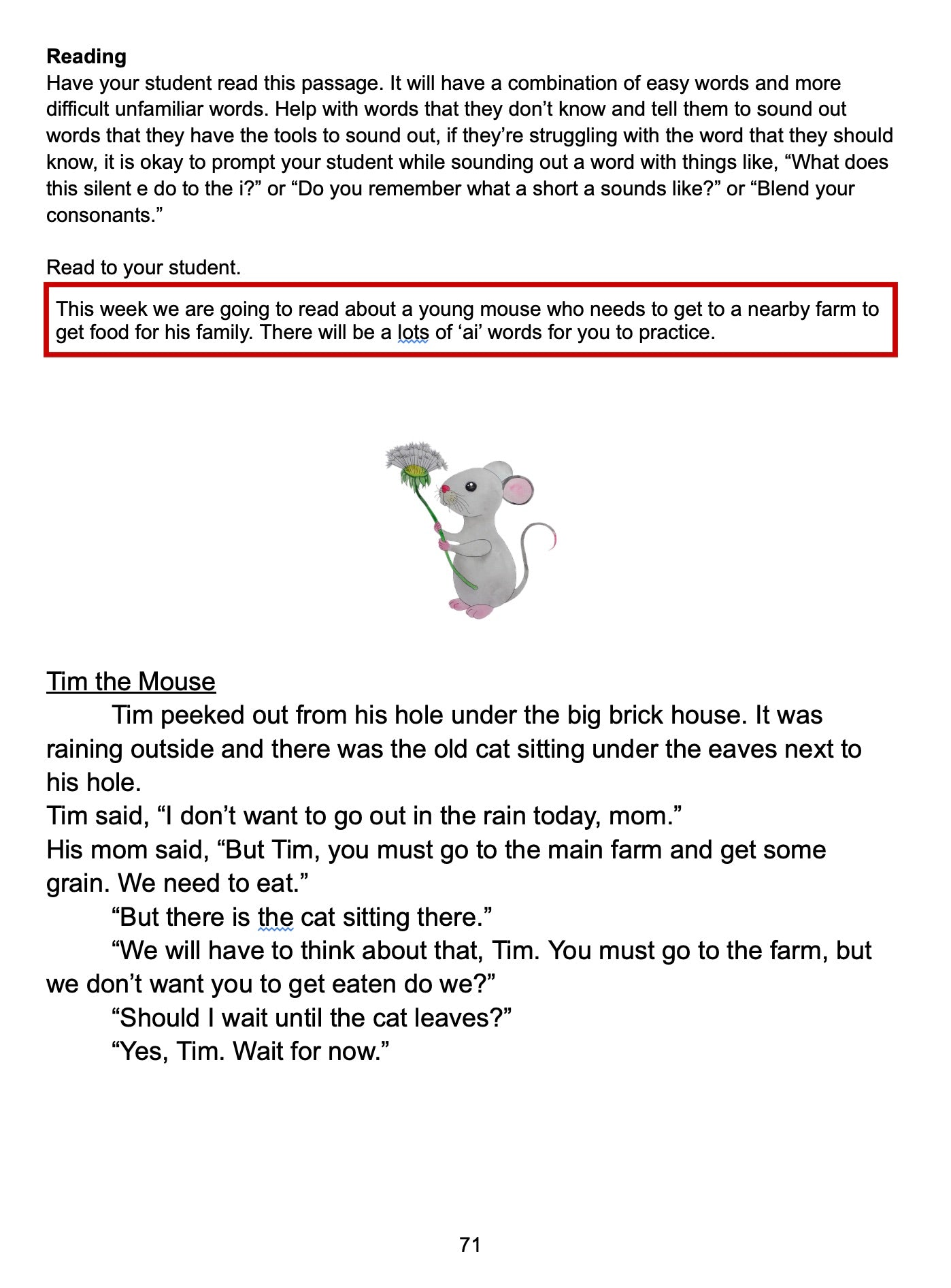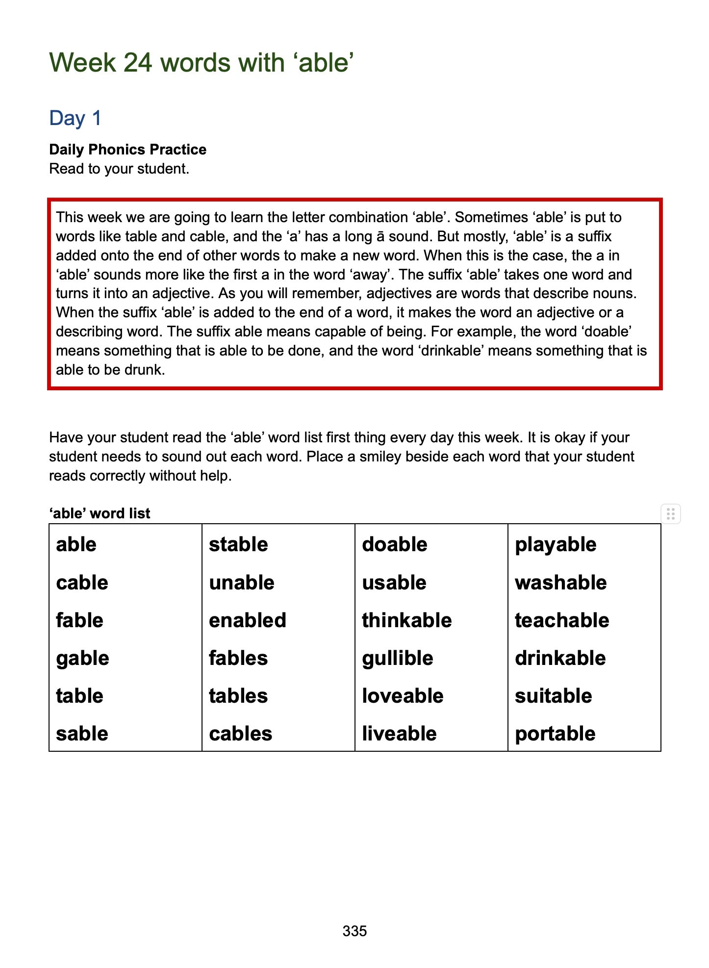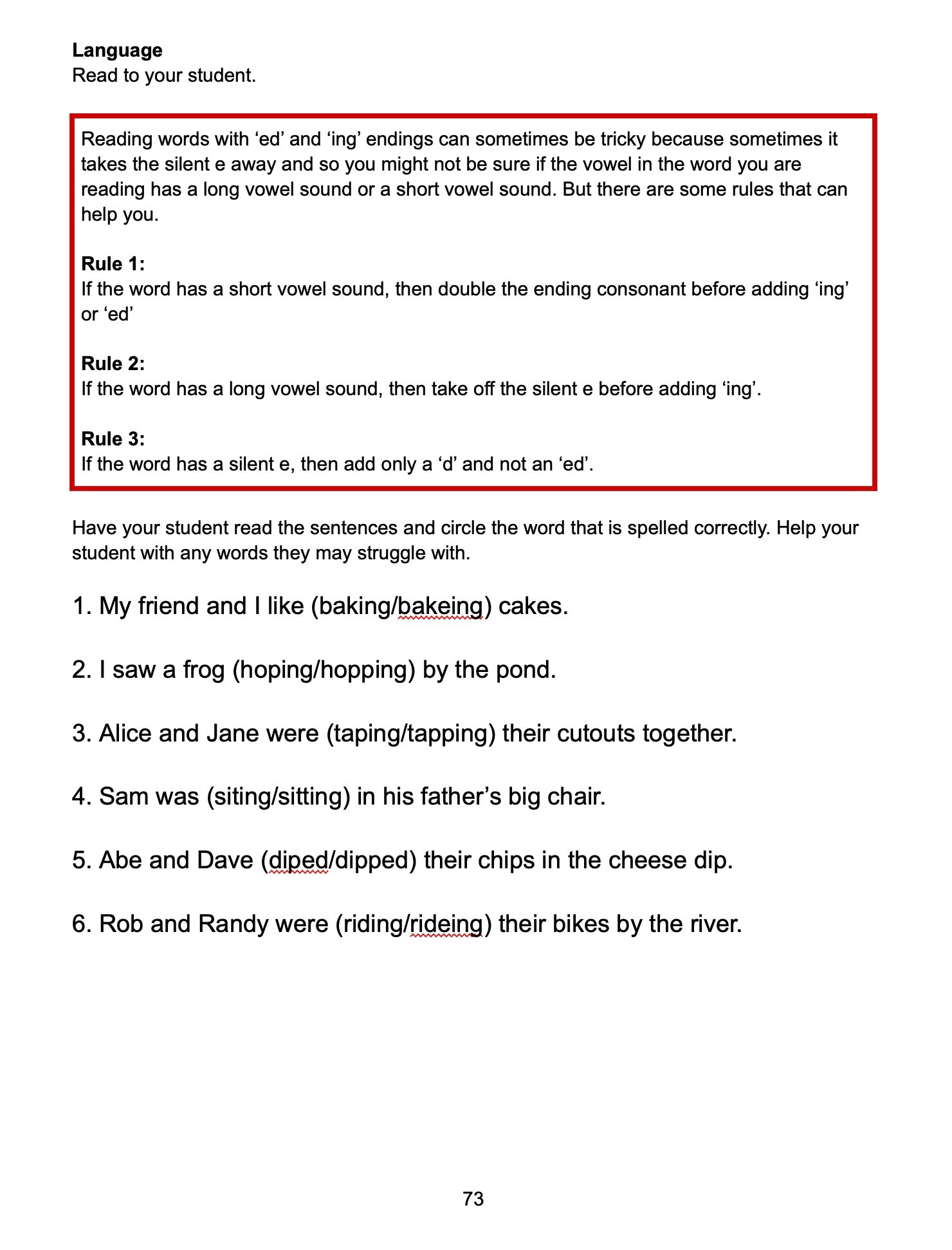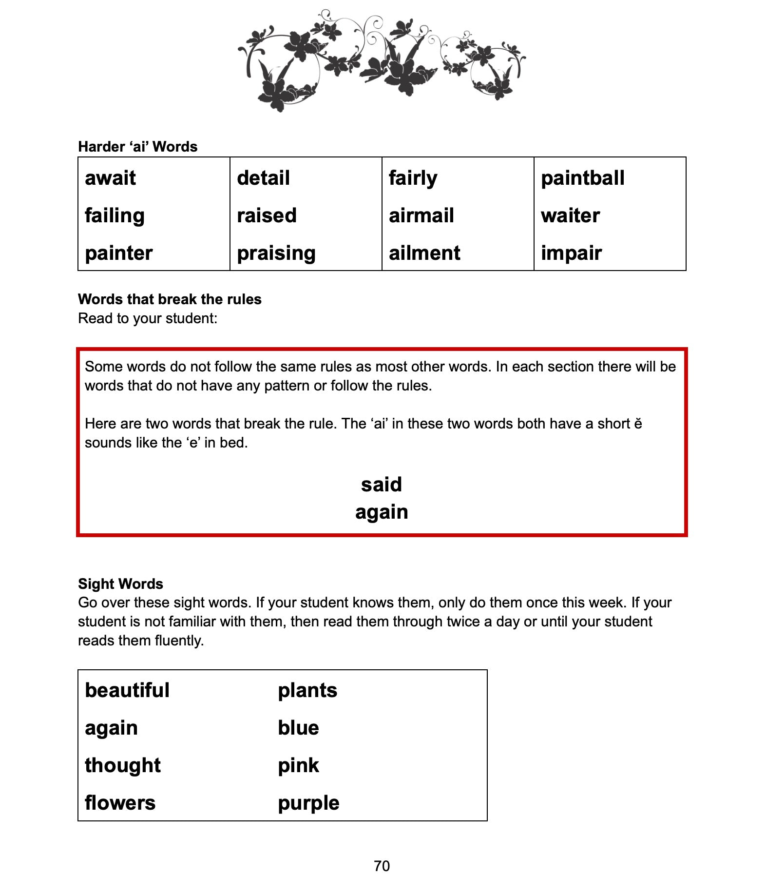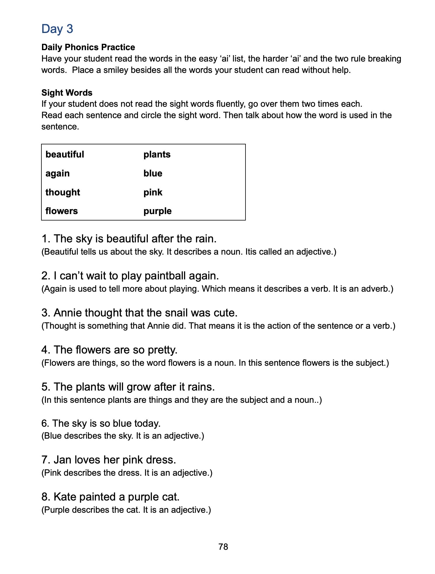 This course begins by reviewing the silent e and then moves into learning more phonics sounds and integrating them into larger and larger words. This book includes a weekly word list with a new phonics sound each week. There will be daily reading passages that will progressively get harder each week of lessons. There are weekly grammar lessons, weekly punctuation and writing lessons and daily spelling lessons. The first half of the book includes sight words. The second half of the book has a list of all phonics sounds and words or sentences for review instead of sight words.