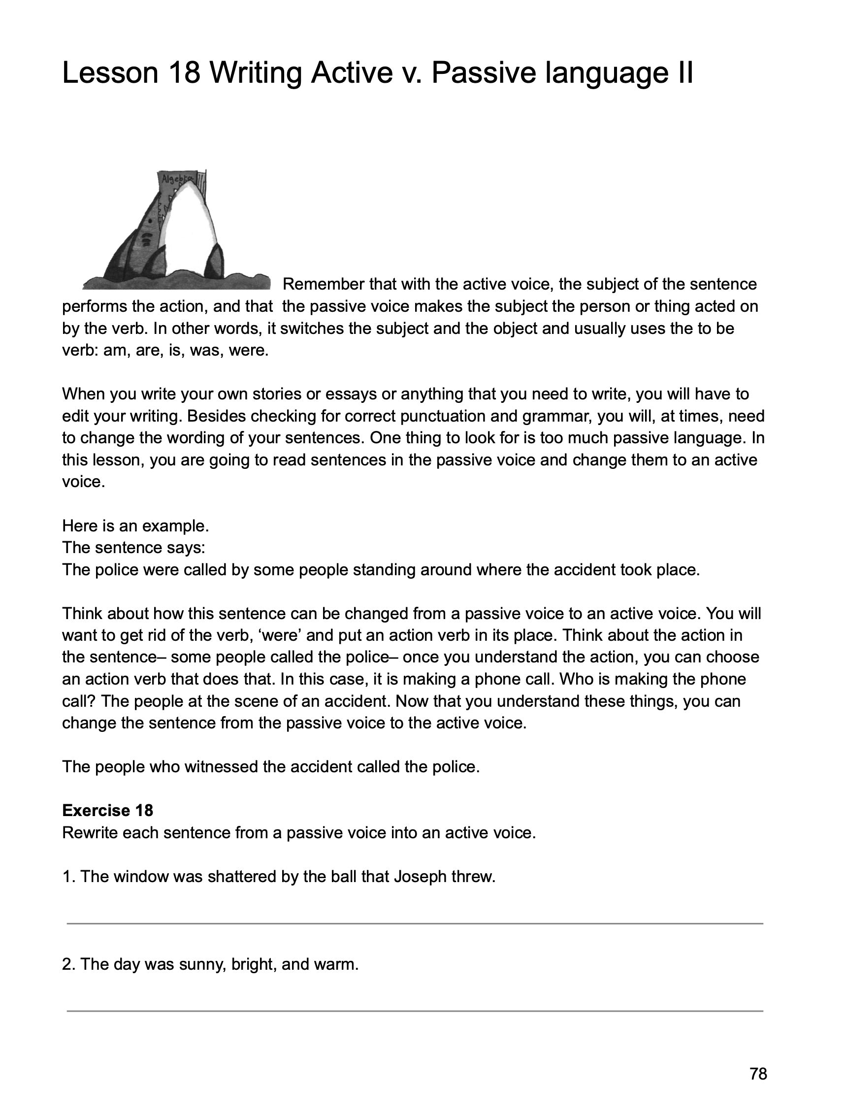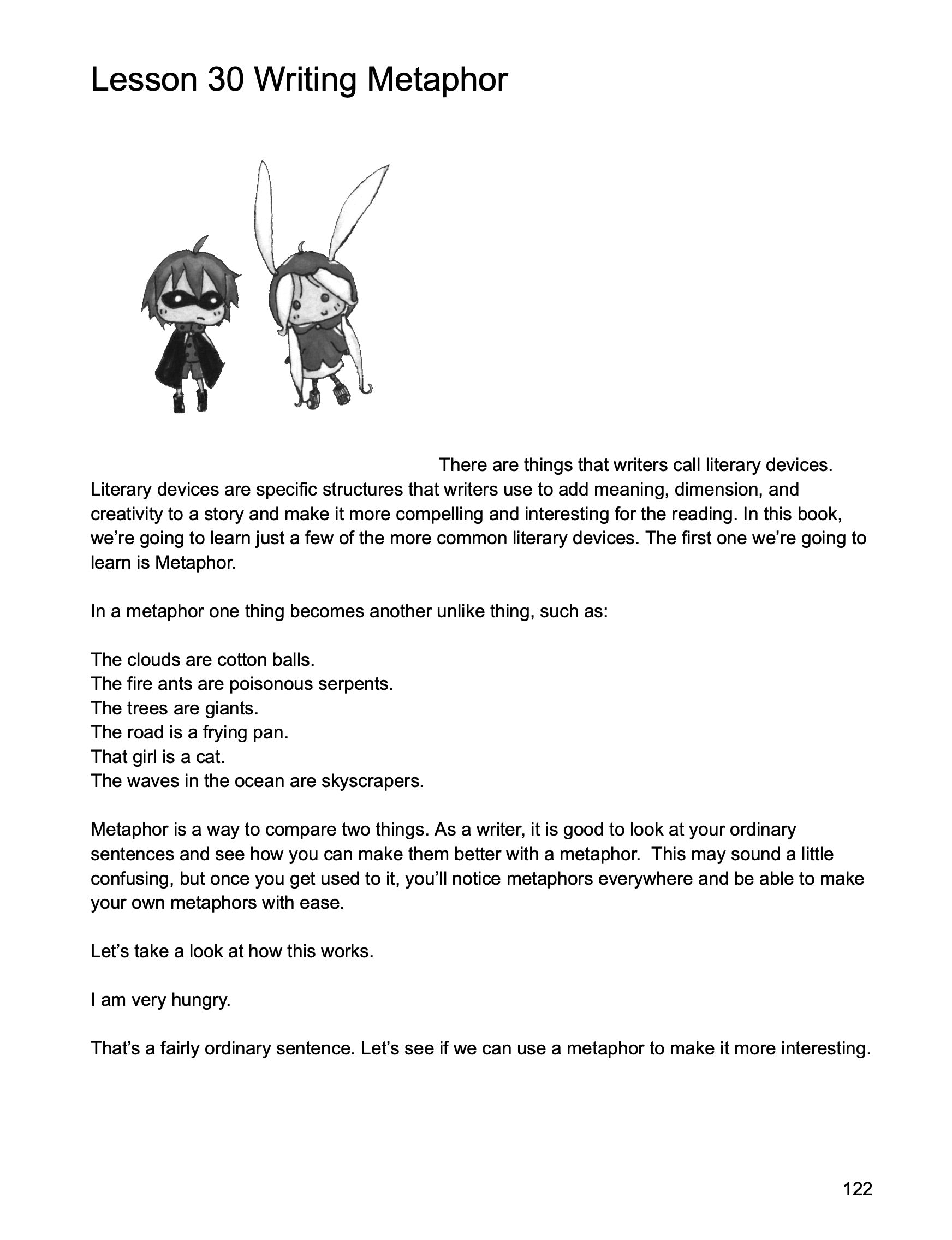 These reading sections include questions for the student to answer to teach reading comprehension. The book also introduces fiction writing, essay writing, and poetry writing along with a variety of literary devices such as metaphors and similes.