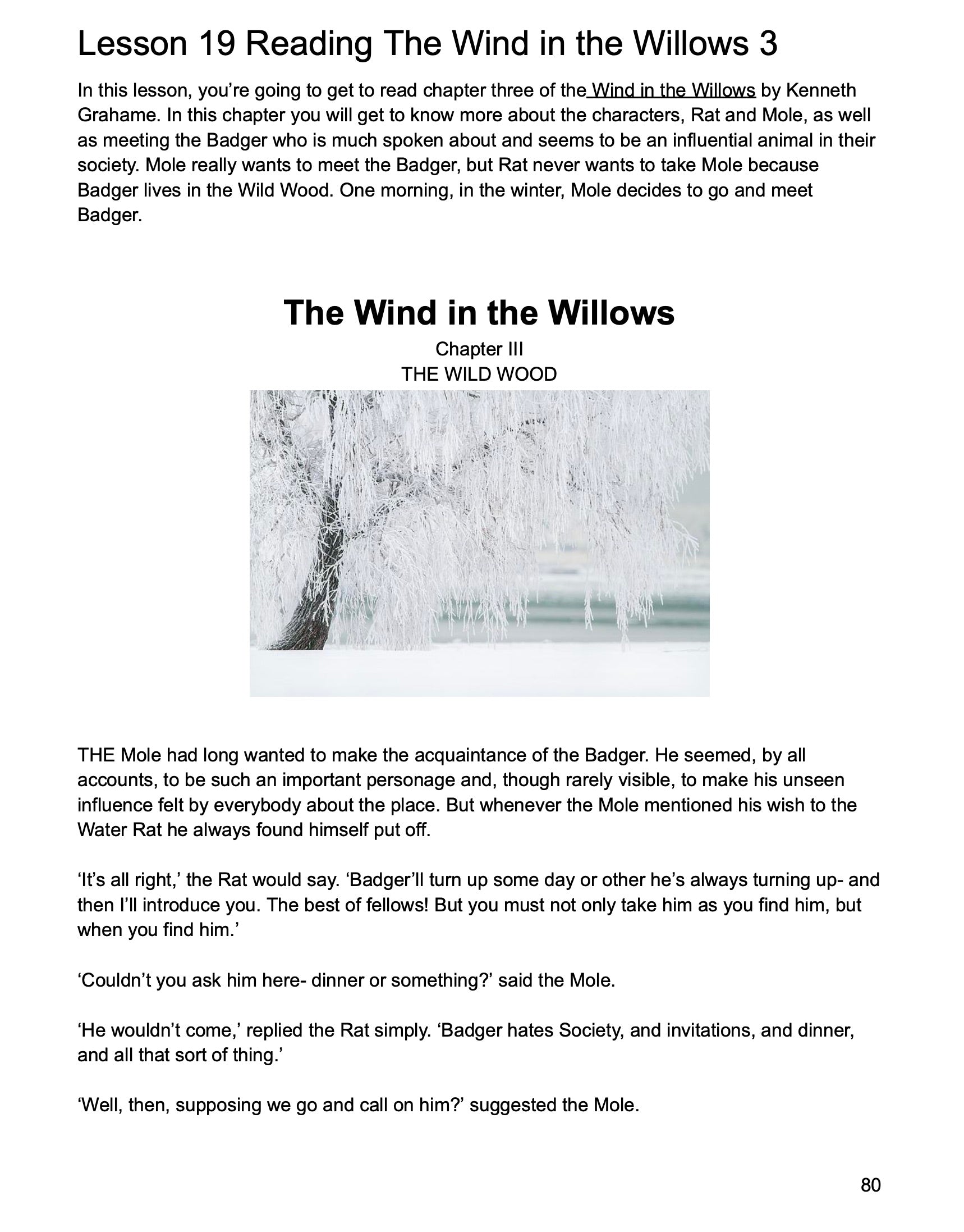 This course book contains parts of novels and full stories from classic literature found in the public domain. Some of the reading assignments include selections from Winnie the Pooh, The Wind in the Willows, Heidi, Grimm’s Tales, The Adventures of Tom Sawyer, and Robinson Crusoe.