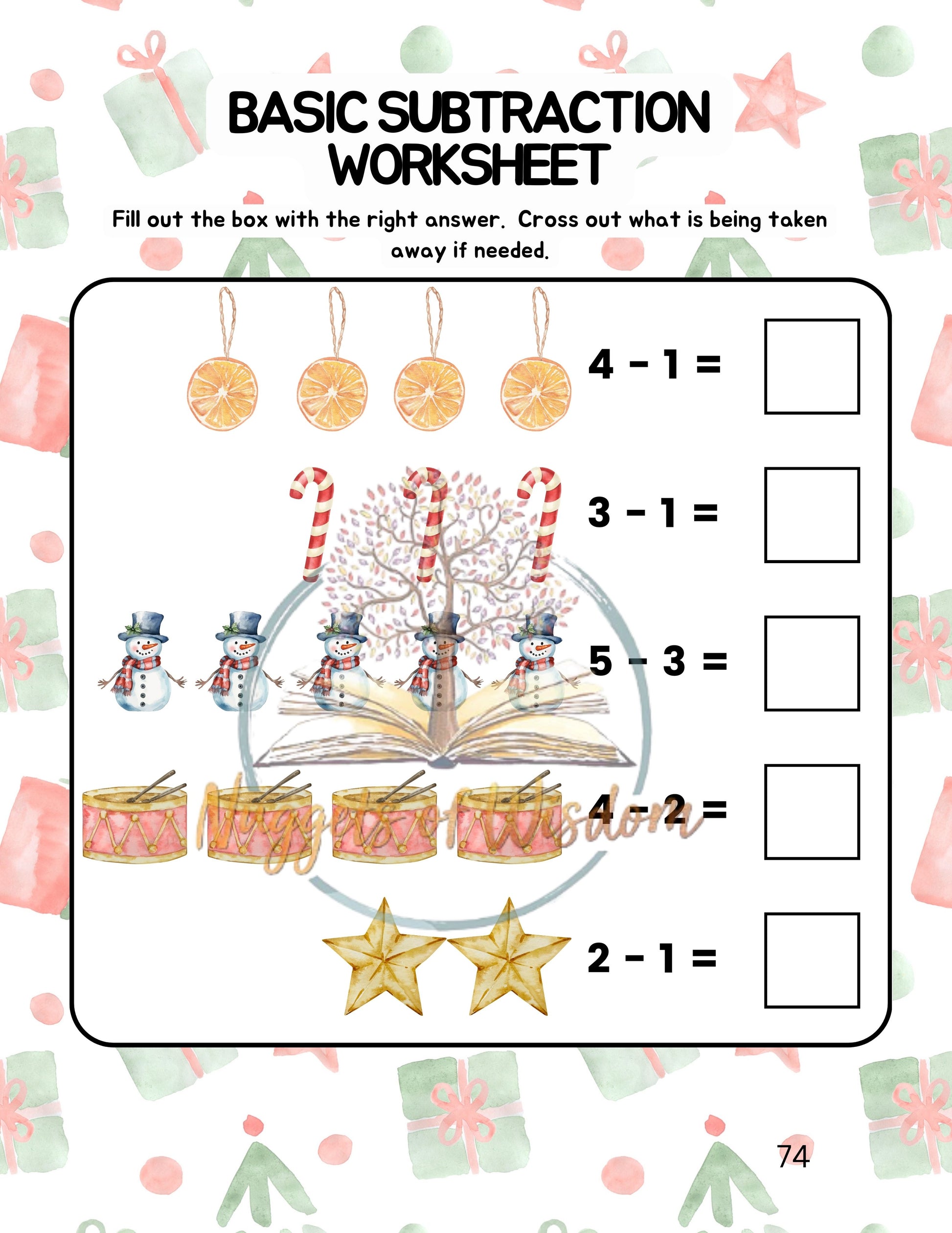 Perfect for early learners! Practice pages cover phonics, handwriting, counting, and color-cut-paste activities built around the December theme.