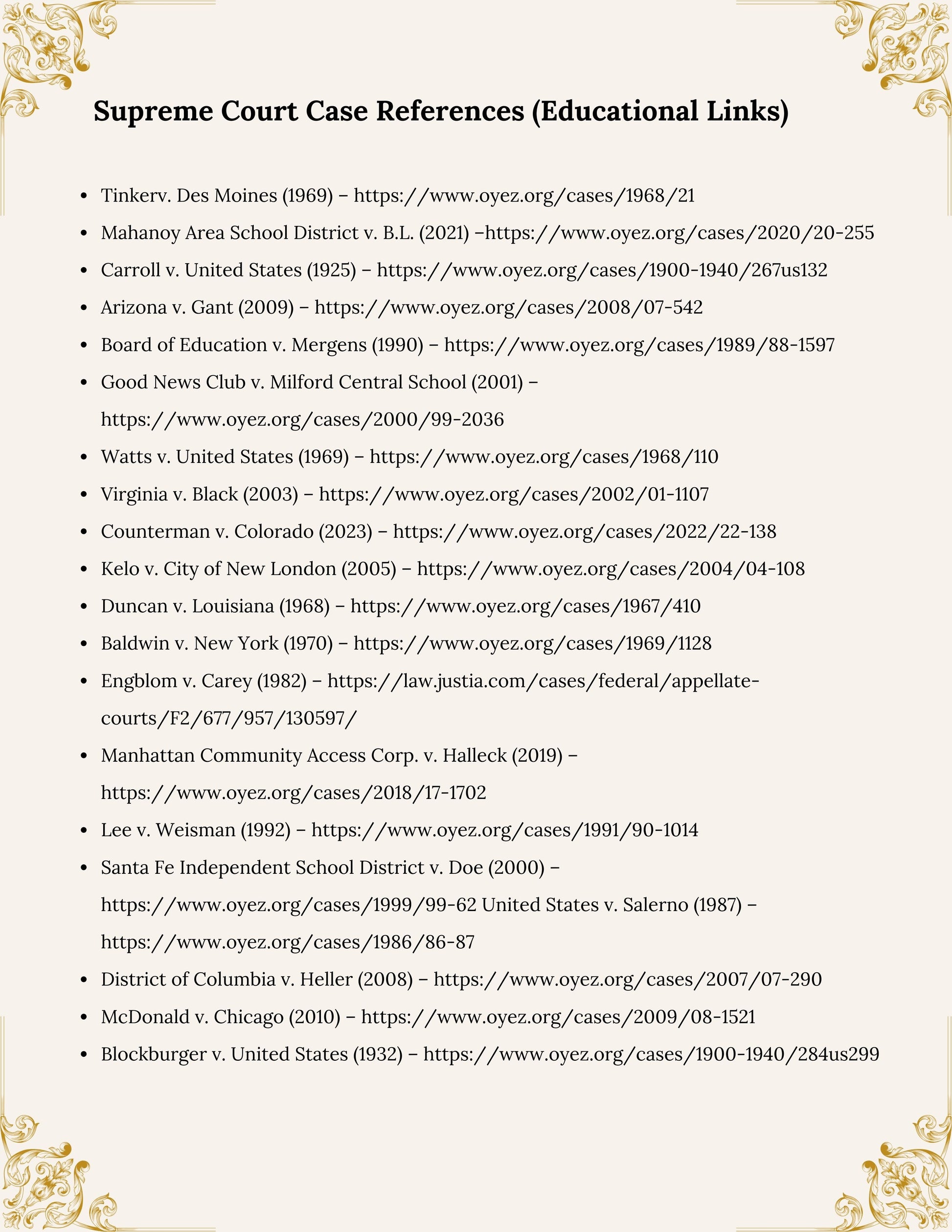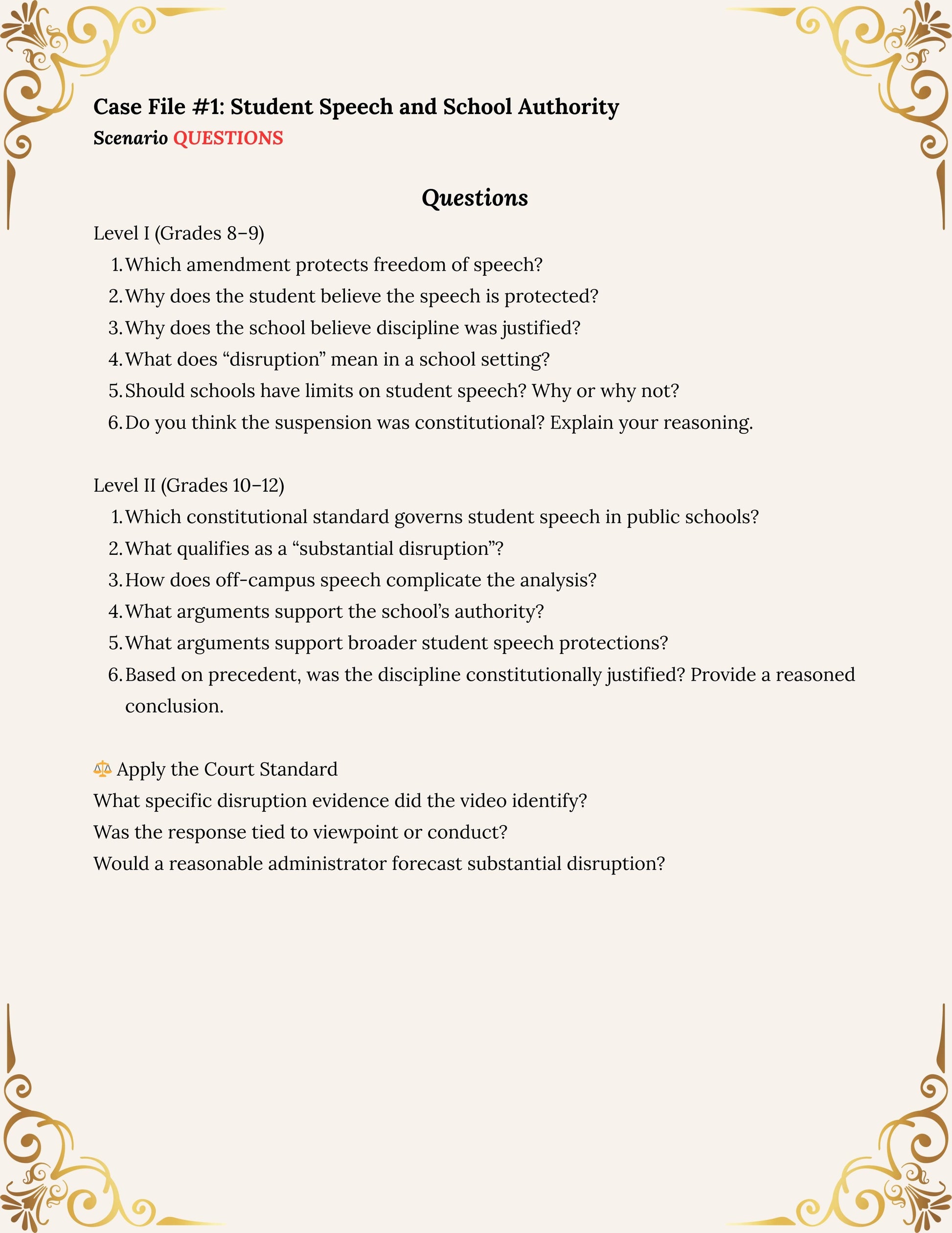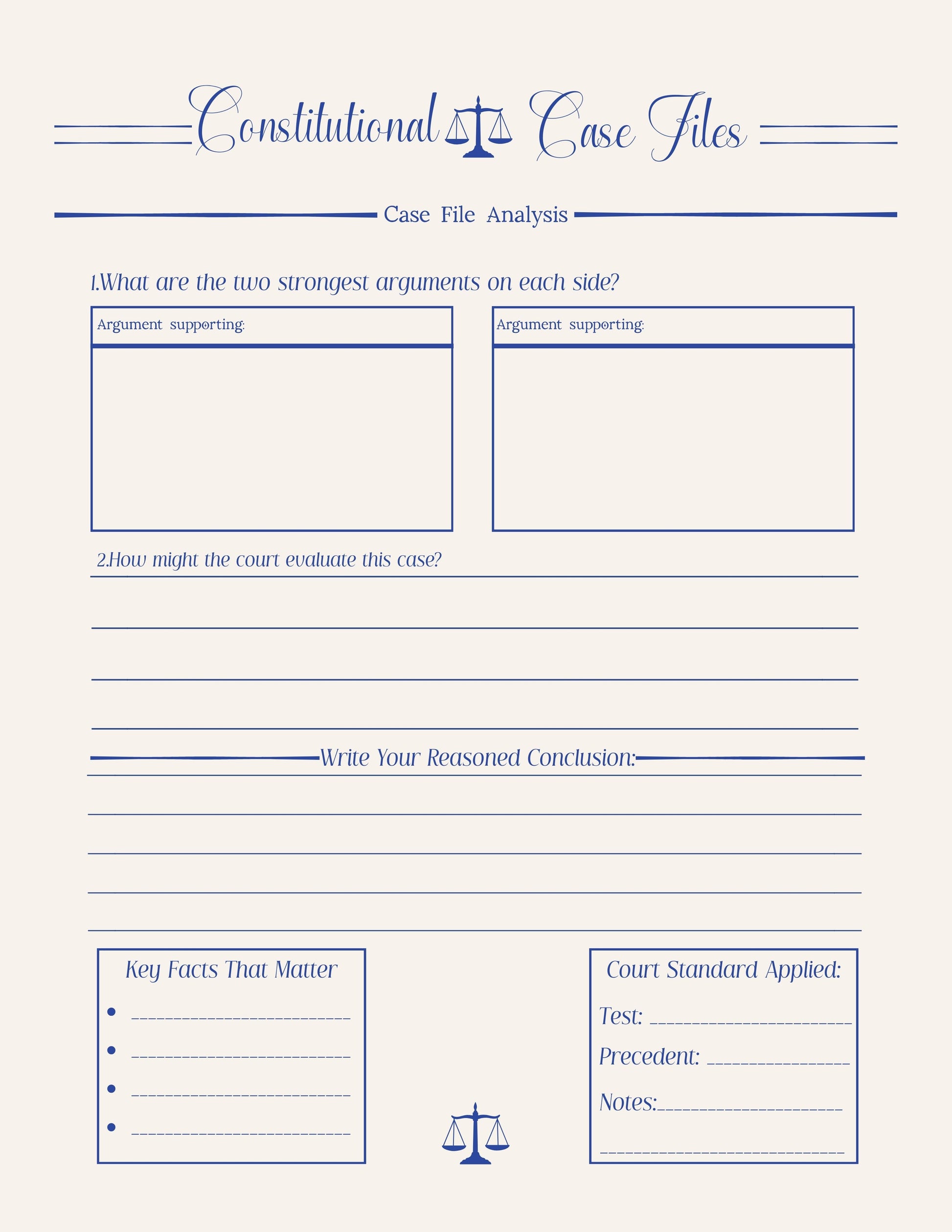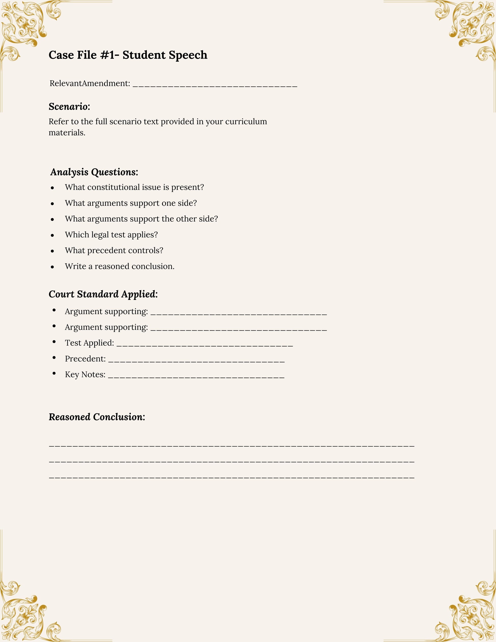 This structured constitutional reasoning curriculum guides students through 12 realistic case studies inspired by landmark Supreme Court decisions. Rather than memorizing dates or political debates, students apply constitutional tests, analyze precedent, and evaluate both sides of complex legal questions.