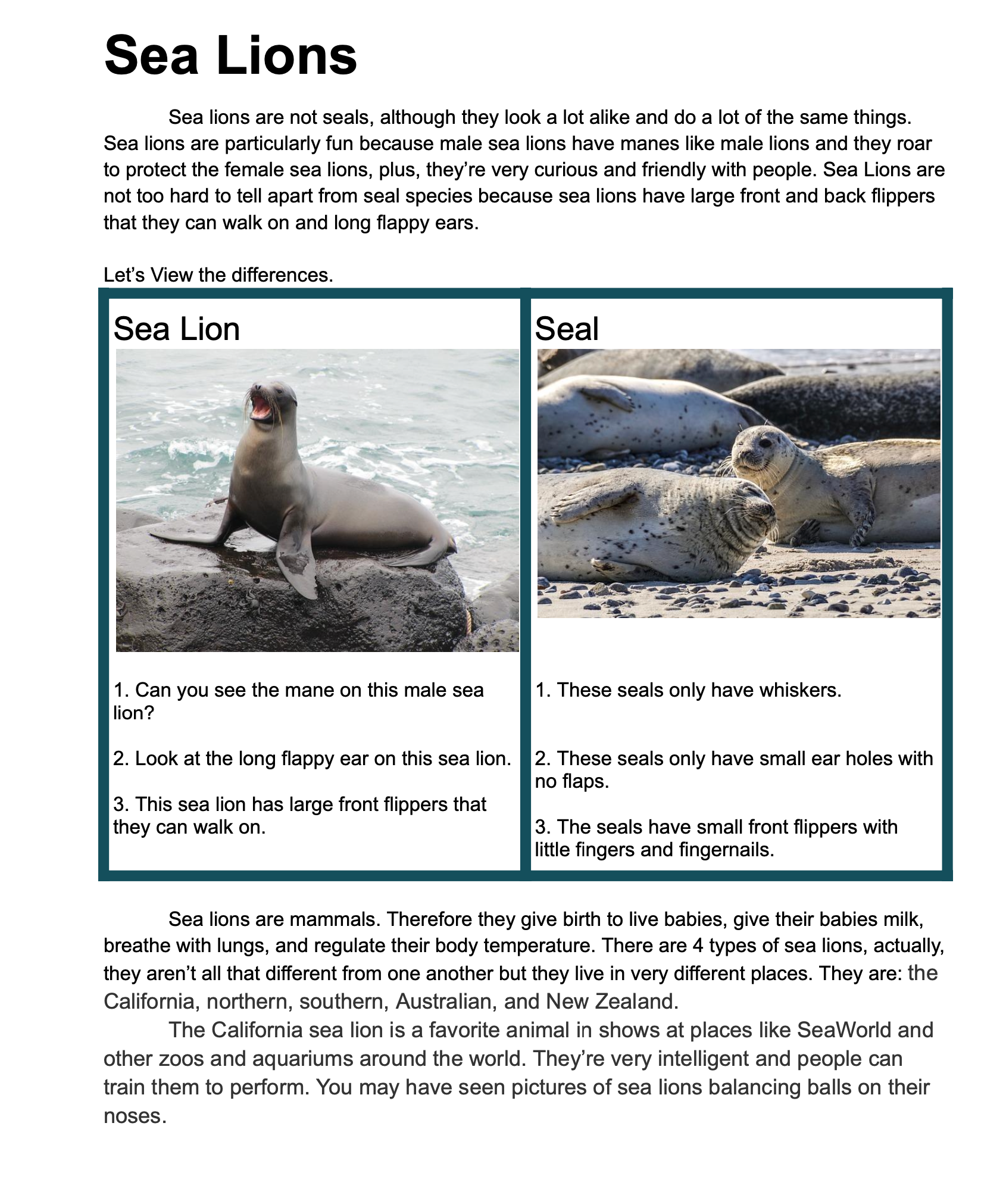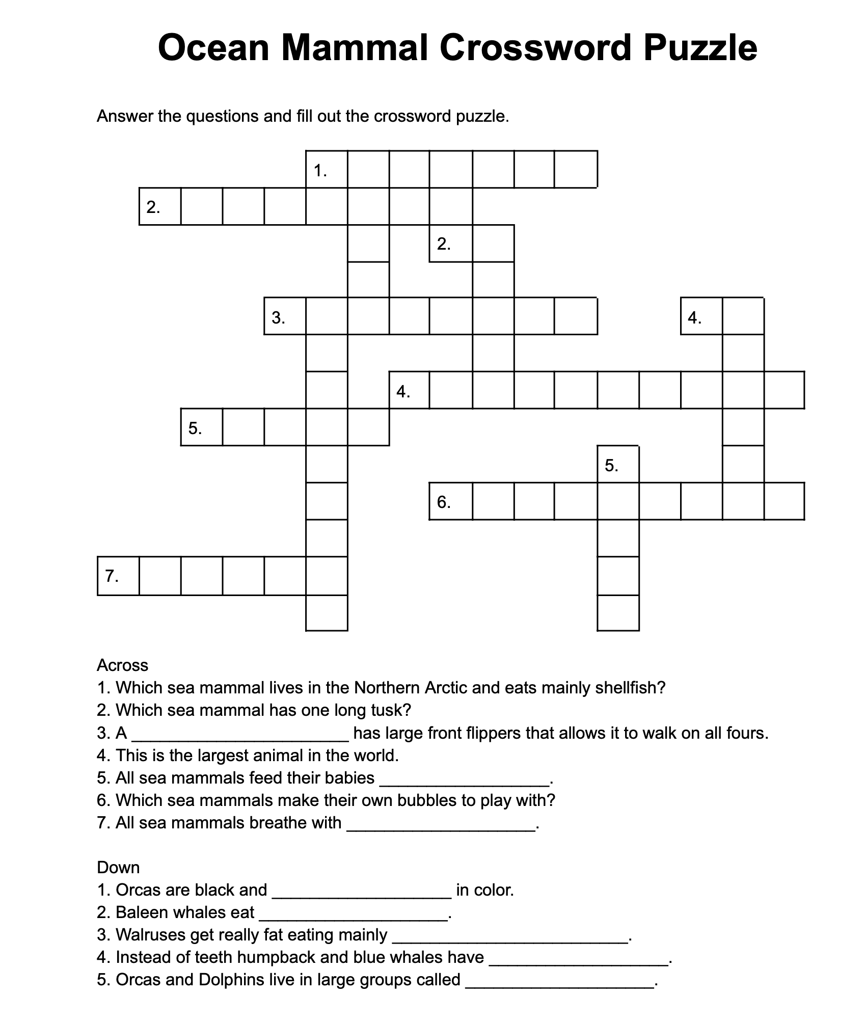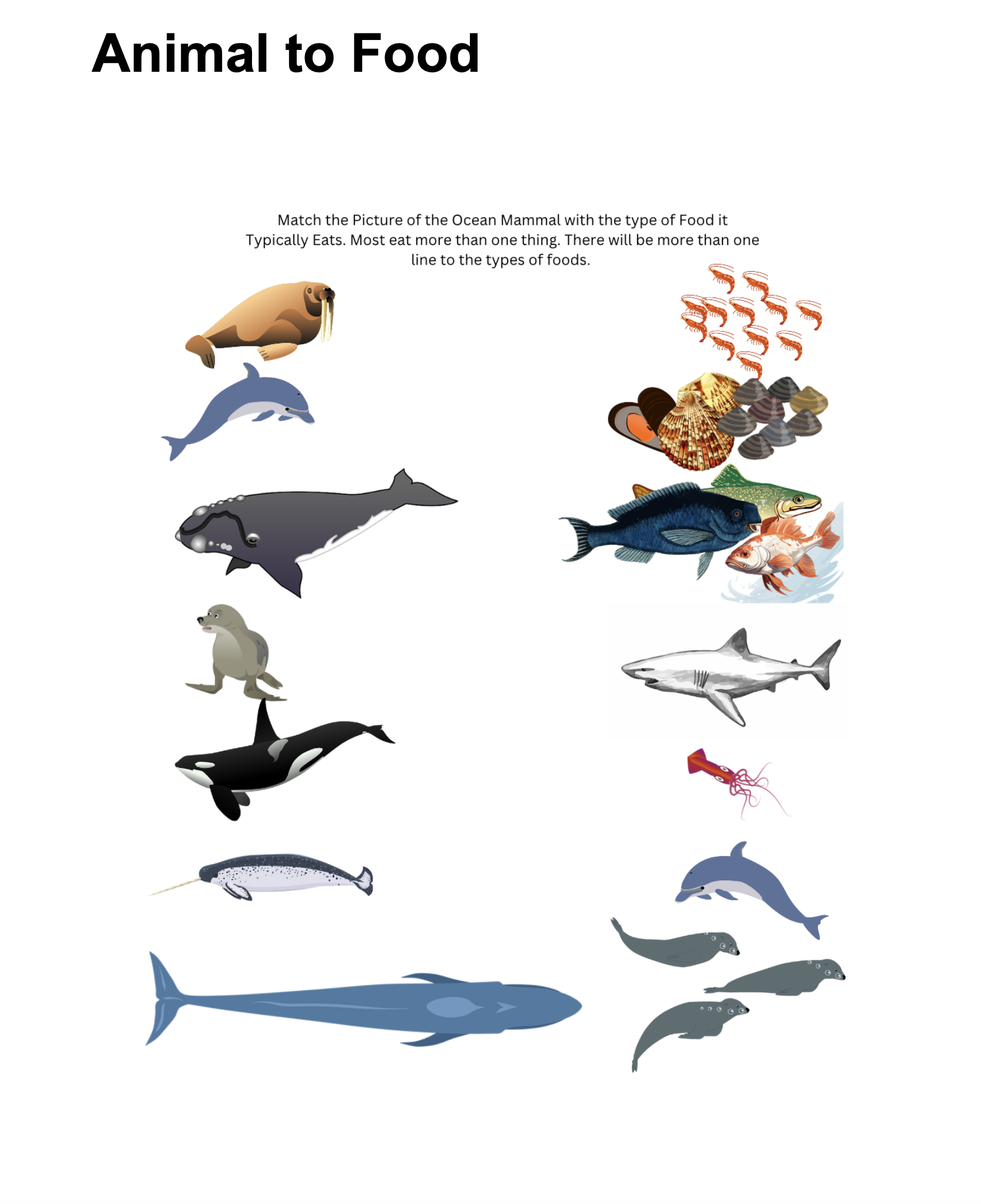 The lessons also include a whale diagram to teach the basic outside parts of a whale, pictures of sea mammals to label, drawing a line from the sea mammal to the type of food it eats, a crossword puzzle, and a word find.