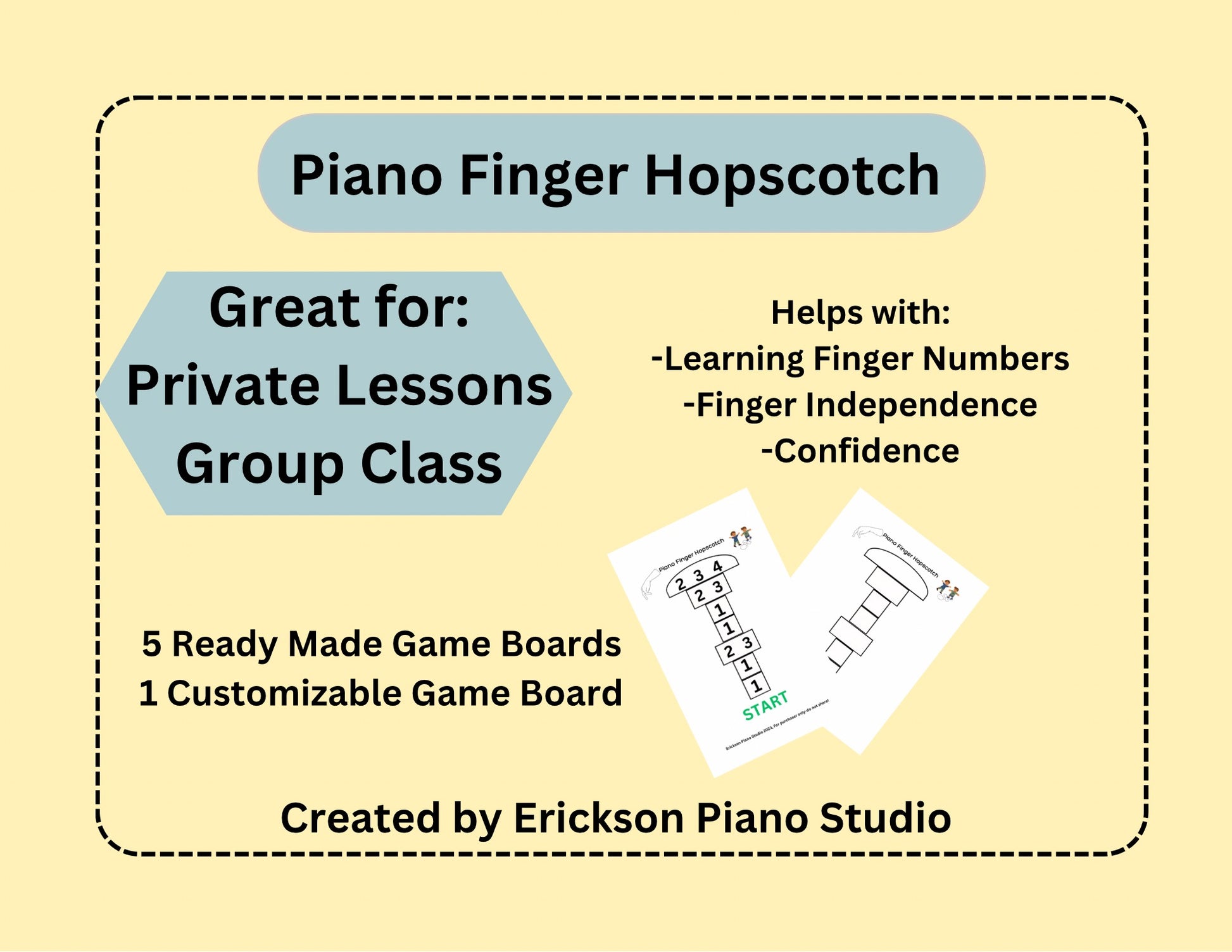 The pack includes: Directions, 5 pre-made Piano Finger Hopscotch game boards, and 1 customizable Piano Finger Hopscotch game board.