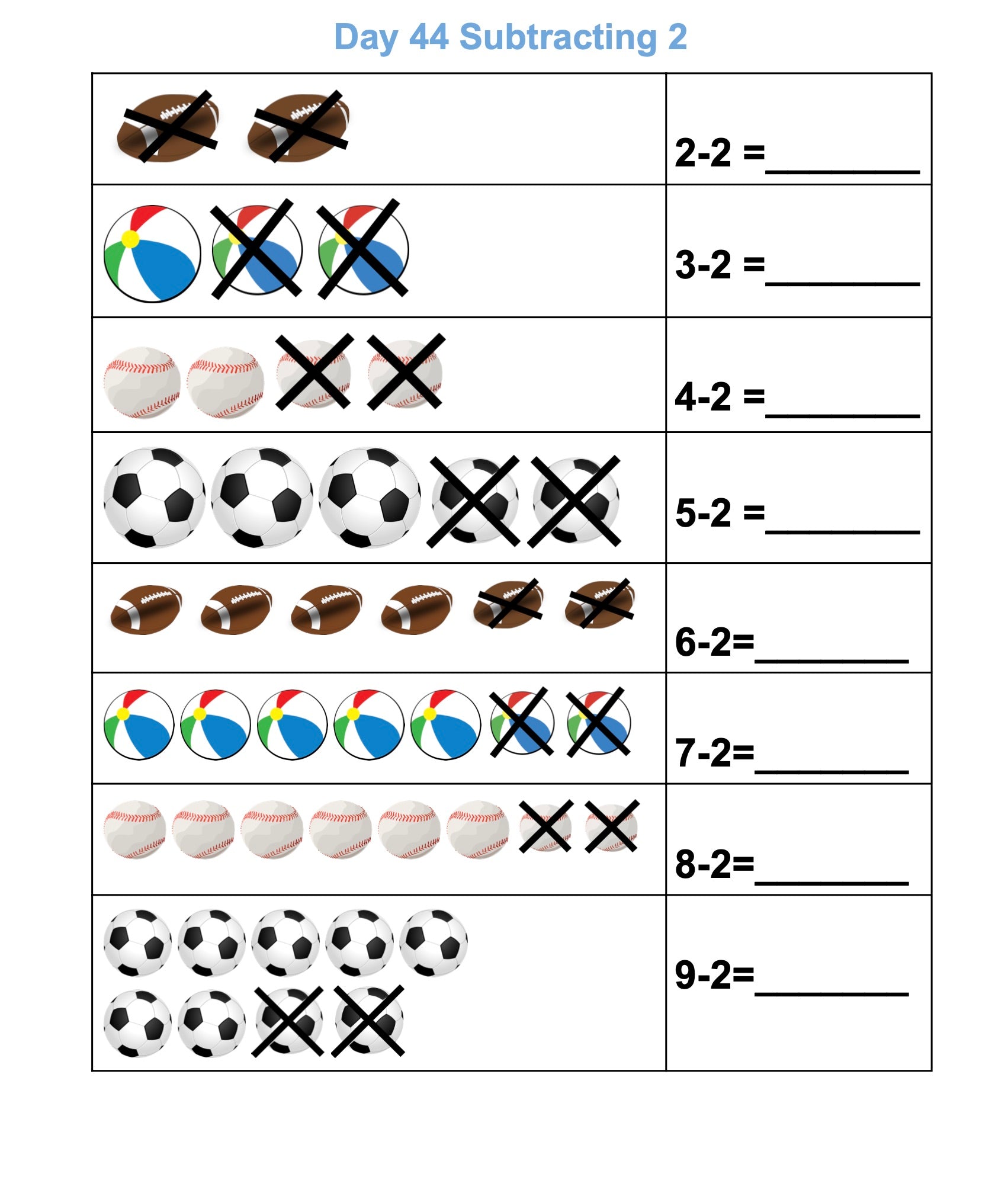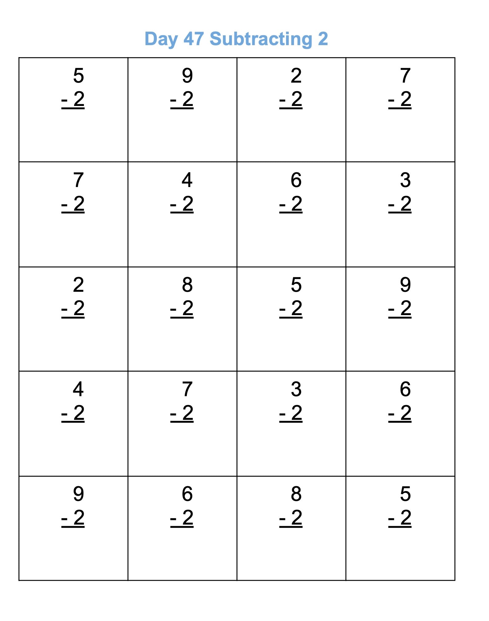 The course, being kindergarten level, only subtracts from 9. From there, Mixed adding and subtracting is covered throughout the rest of the course through the 120 days to keep those skills fresh.