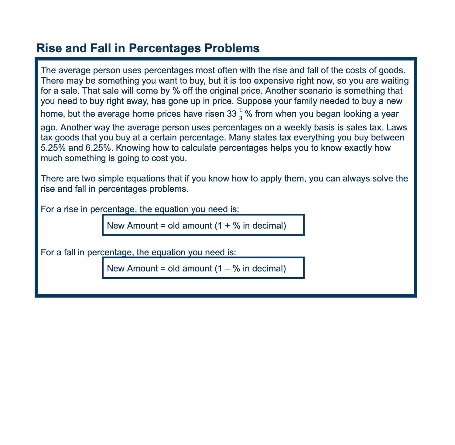 An Algebraic Approach to Percent Problems is a 20-page math lesson on percentages at the pre-algebra to algebra one level.
