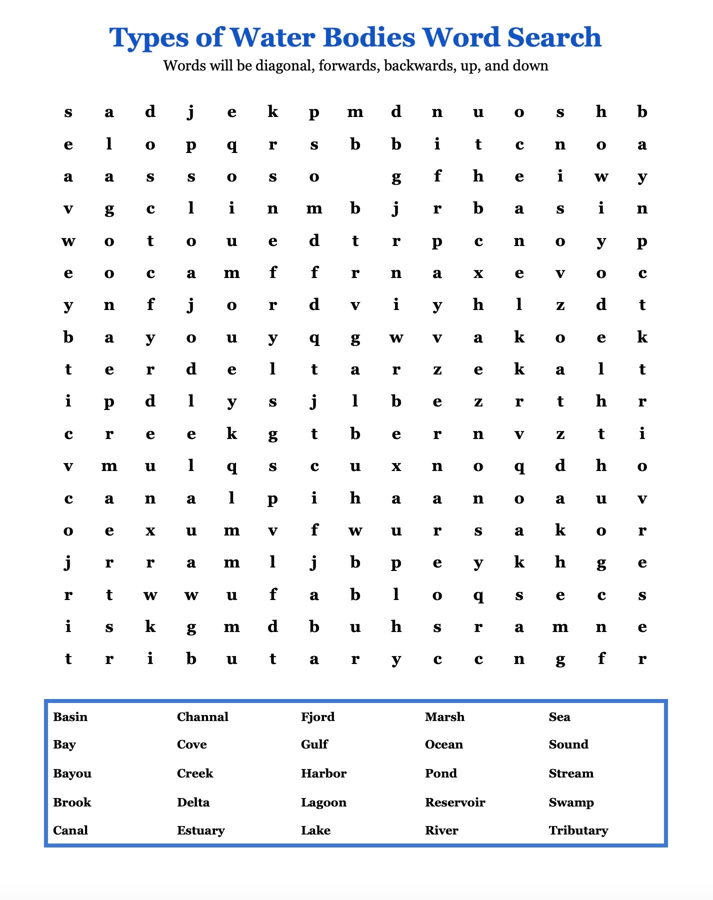 Once the information is covered with pictures of each type of body of water, there are 18 open ended questions to answer about the different bodies of water and the information covered in the lesson section. Next there is a matching of pictures with names of bodies of waters and finally there is a word search for fun.