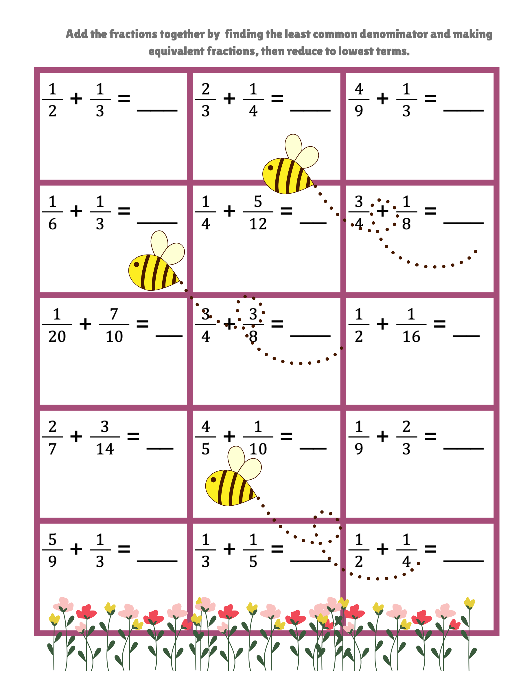 2 adding fractions with the necessity of finding the lowest common denominator and making equal fractions worksheets