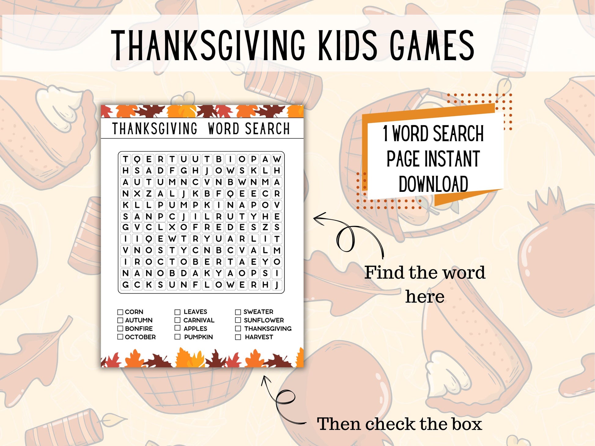 Printable Kid Activities for Thanksgiving. Word Search, Maze and I Spy. Also includes a front cover page so teachers, daycare providers, and home schoolers can make it an activity packet for your kids.