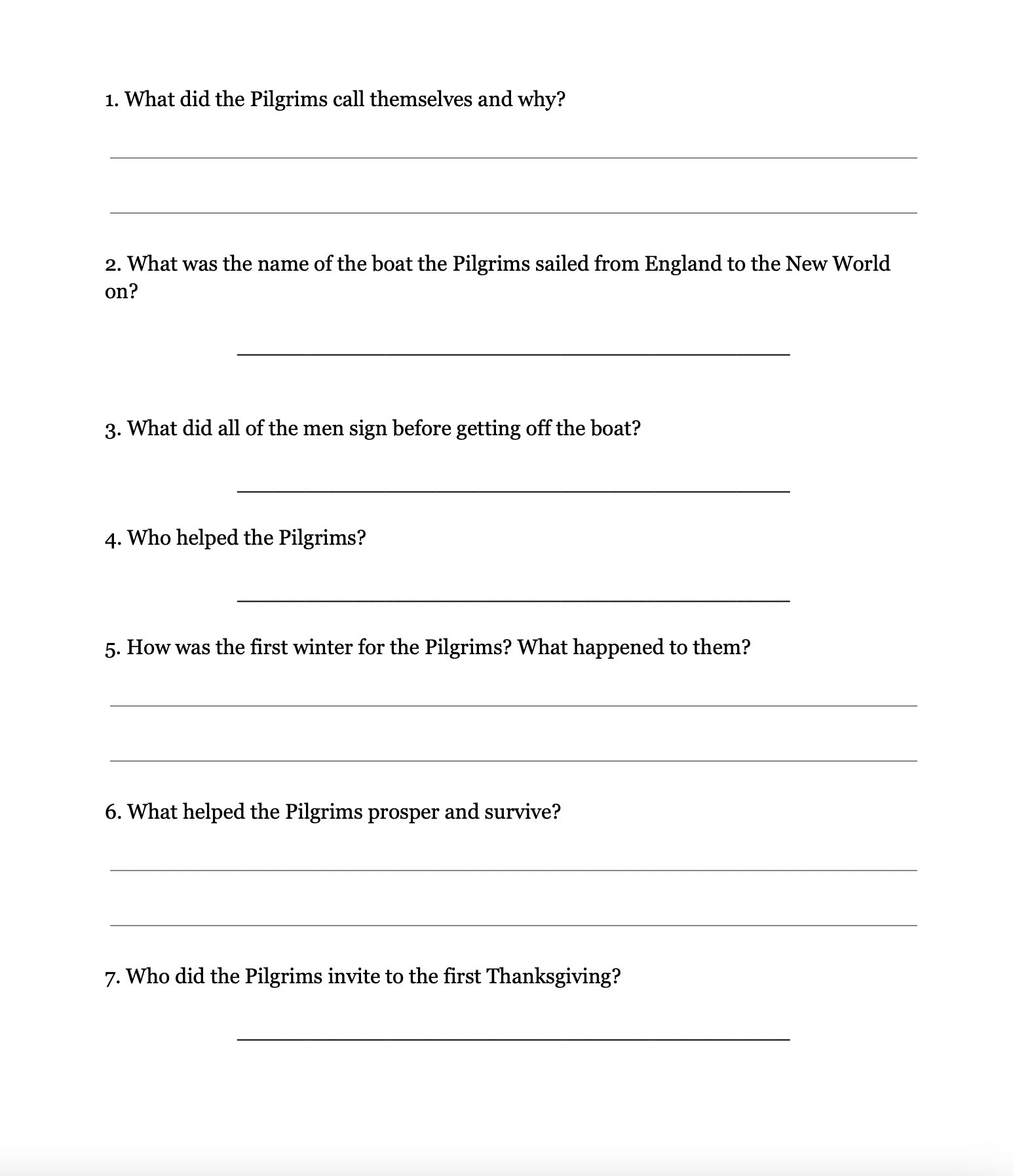 This lesson is appropriate for students who can read a story and think critically about it and to write and answer questions. The purpose of this lesson is to teach the history of the Pilgrims, touch on the importance of religious freedom, hard work, and a love for God and family. This lesson also gives a historically accurate view of what the first Thanksgiving would be like and why the Pilgrims would be so Thankful.