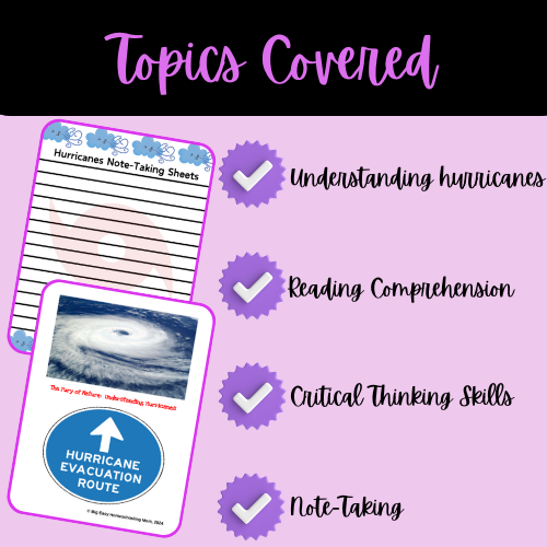Complementing the reading passage and questions are structured Note-Taking Sheets. These sheets provide a framework for students/homeschoolers to actively engage with the material as they read. They encourage students/homeschoolers to identify key concepts, define important terms, and summarize main ideas in their own words. This active learning strategy promotes better retention of information and helps students/homeschoolers organize their understanding of hurricanes.