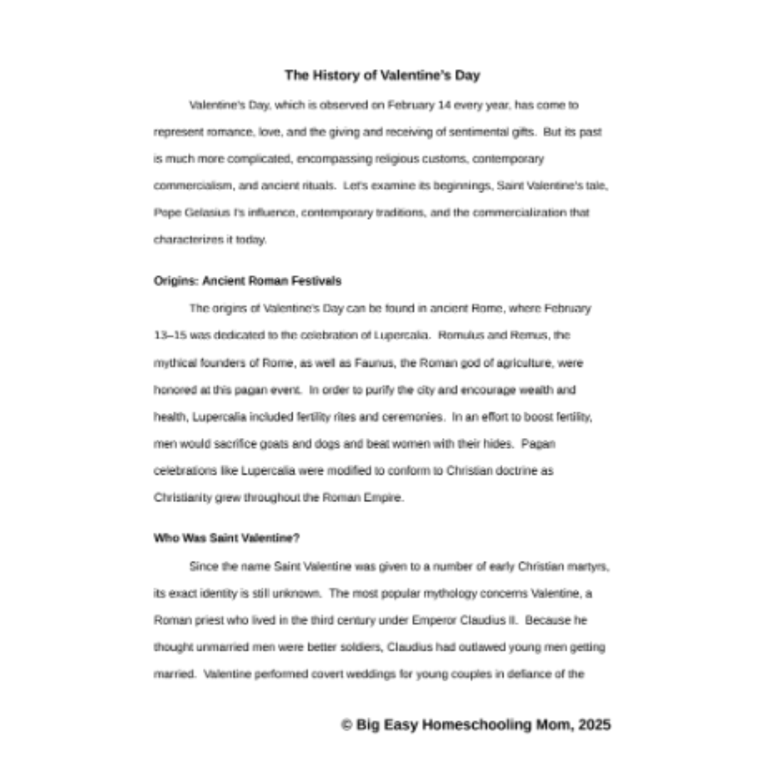 The History of Valentine’s Day Reading Passage, Q&A, and Note-Taking Sheets resource unravels the story behind one of the world’s most celebrated holidays, tracing its origins from ancient Roman traditions like the Feast of Lupercalia to its transformation into a day of romance and love.