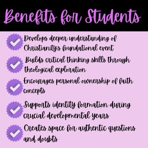 This thoughtfully crafted guide breaks down complex theological concepts into accessible language without sacrificing depth or academic rigor. Perfect for both classroom settings and homeschool environments, this resource bridges the gap between simplified children's Easter stories and adult-level theological texts, meeting teenagers exactly where they are in their faith and educational journey.